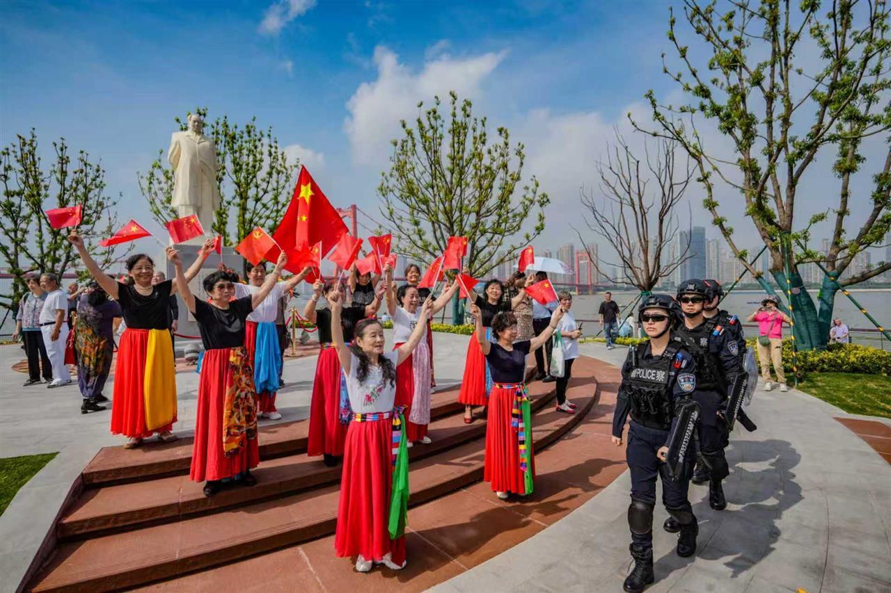 10月1日清晨,江面笼罩着一层薄雾,武昌湾1956公园正式对外开放,一早便有大批市民、游客循着红色足迹涌入这片滨水空间。“刚去武昌农讲所参观完,我们专程打卡红色景点!”游客付女士携10余名舞蹈爱好者,在广场中心的毛主席雕像前挥舞五星红旗并合影拍摄。“游玩时看管好随身物品。”PTU轻机动警队队员姚迪携队员们穿梭巡逻在武昌湾江滩,提醒游客注意安全。