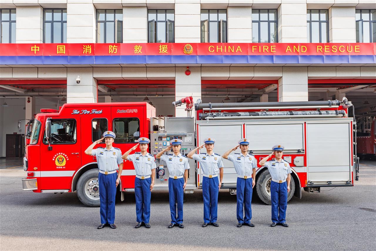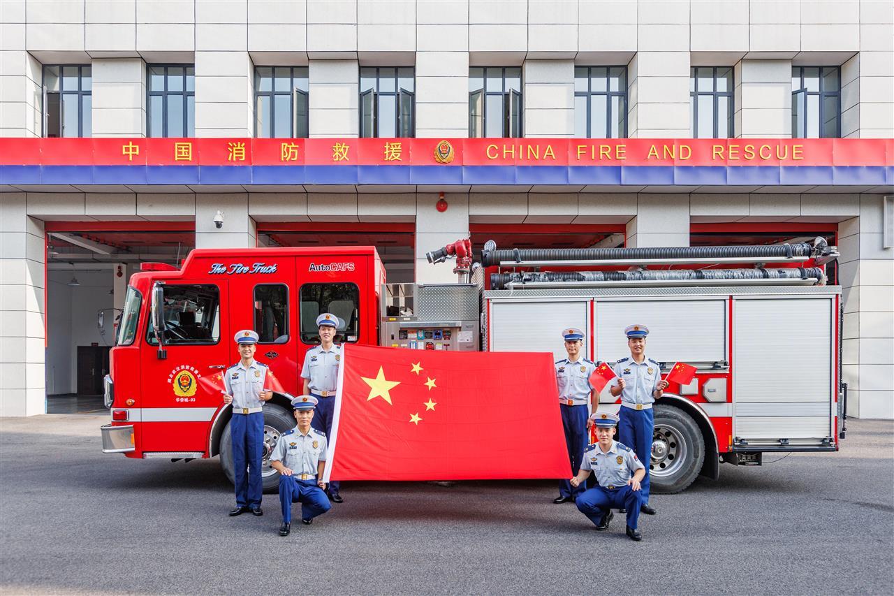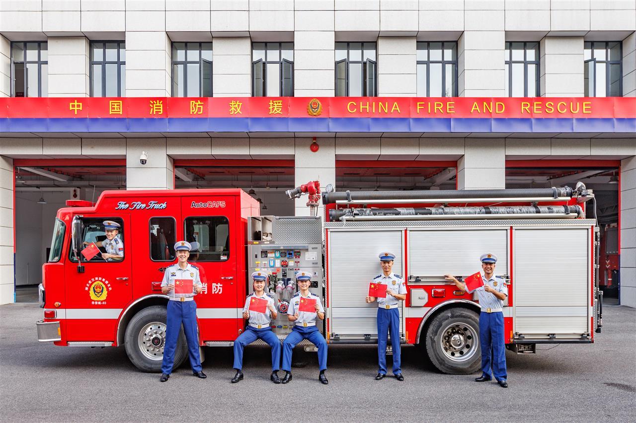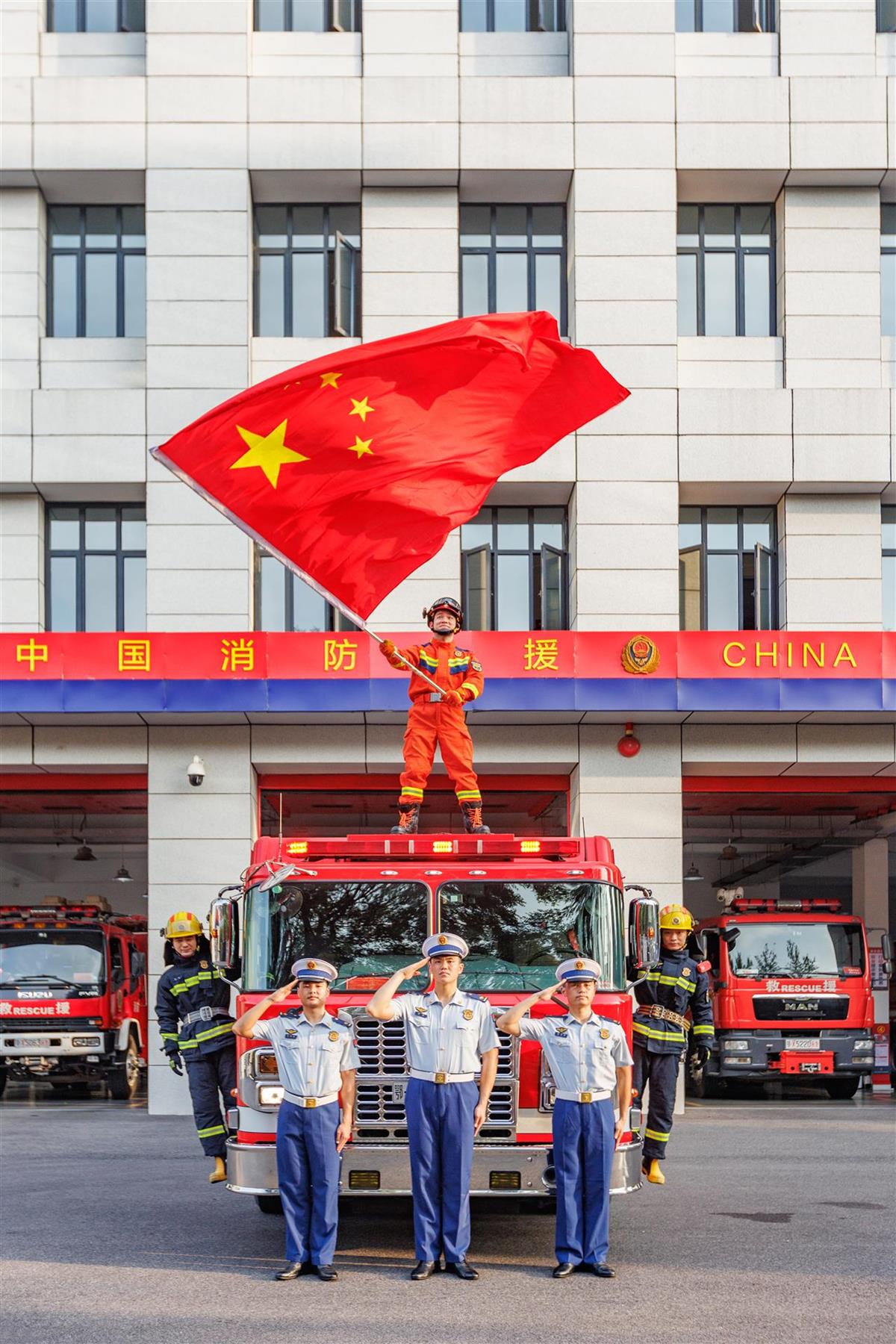 我们熟悉的消防员,总是与“急促”相连——警铃响起,他们冲锋的背影定格在火场与洪流之中。今天,他们暂缓脚步,穿上象征着责任与荣誉的“火焰蓝”,在新中国76岁华诞之际,与心中的信仰之红留下最灿烂的合影。