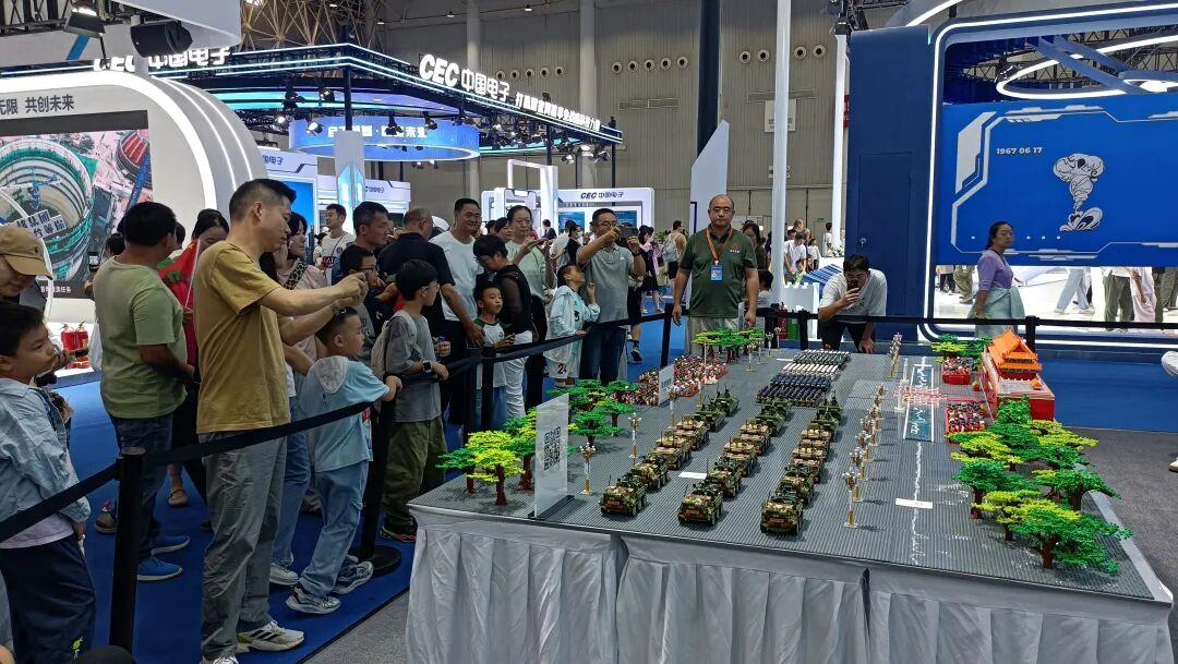 在积木拼成的九三大阅兵模型前,围满了前来观战的游客
