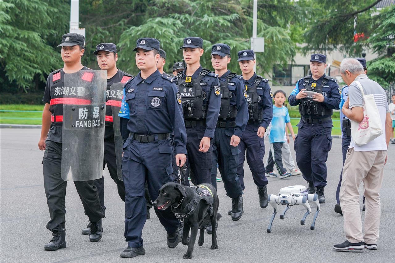 10月2日下午,新闻记者在东湖梨园大门、东湖绿道梨园段等处看到,身穿义警马甲的部分义警与巡特警队员一道,携带机器狗和警犬来回巡逻,他们的存在,给游客带来莫大的安全感。在梨园广场绿道入口前,武汉航海职业技术学院10余名身穿红色背心的大学生义警分工明确,他们分别在斑马线两头和绿道入口处,协助现场交警、快骑警等维持交通秩序,引导游客过斑马线,成为路口一道亮丽的“志愿红”。