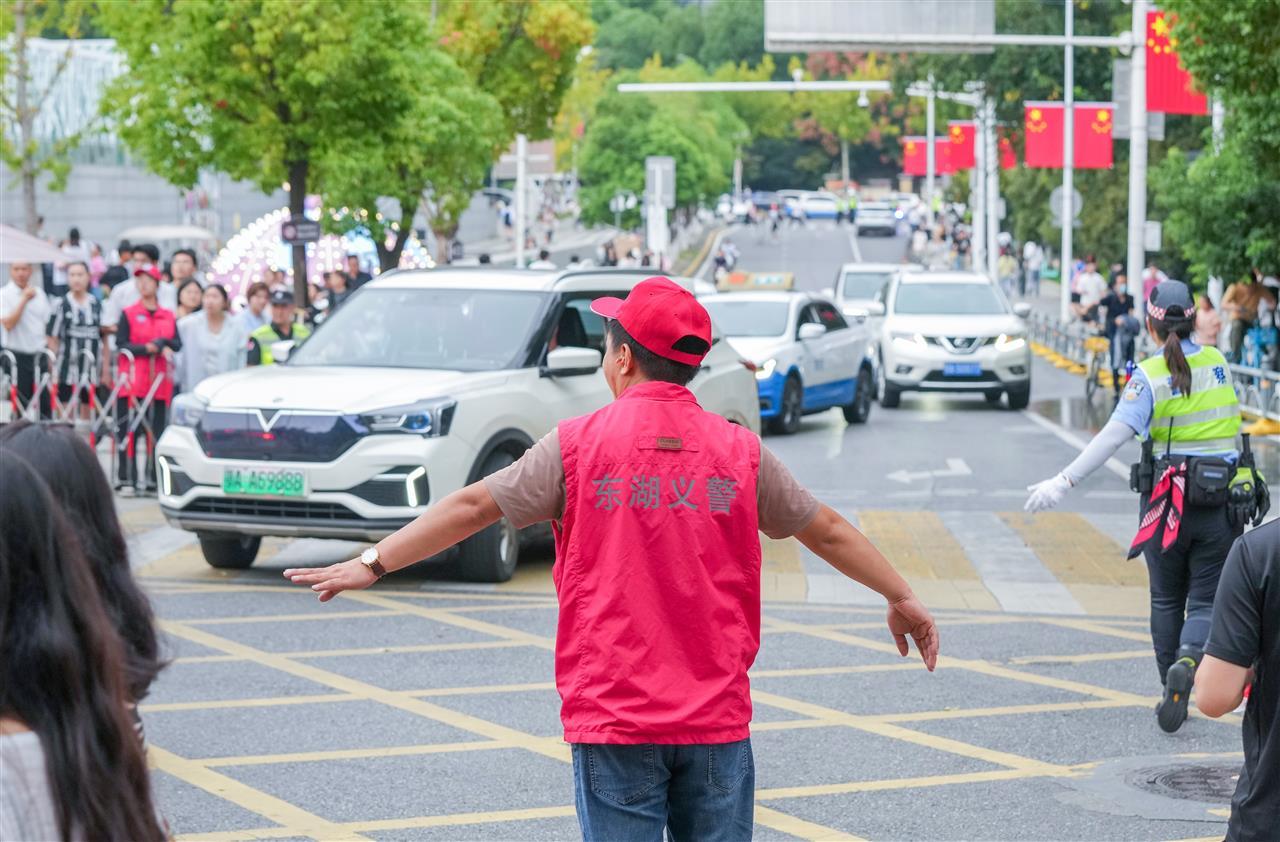 据介绍,在东湖各景区人流密集的关键节点,义警队伍已成为守护秩序的重要力量。他们身着统一志愿标识,主动承担起多重职责:在景区步道上,他们穿梭巡逻,及时提醒游客保管好随身物品,协助疏导拥挤人群;遇到游客突发身体不适,他们第一时间衔接医疗资源,提供基础医疗救助服务;在景区周边交通枢纽,他们配合交警引导车辆有序停放,协助维护路口通行秩序,有效缓解了节假日交通拥堵压力。