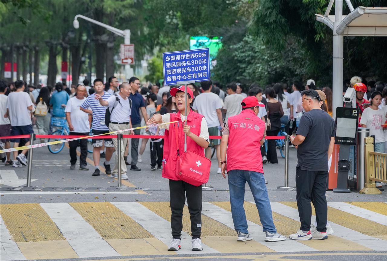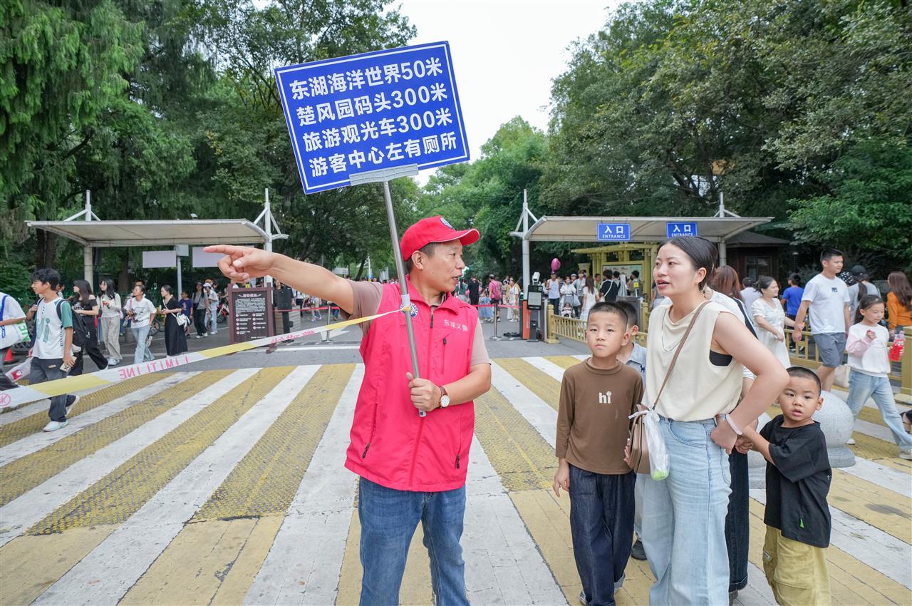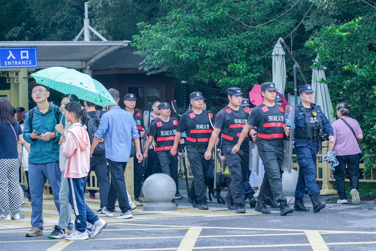 为保障游客出行安全、维护景区秩序,东湖风景区在整合巡特警、交警等专业安全力量的基础上,每日投入100余名义警,分布在梨园、欢乐谷、磨山、落雁、马鞍山森林公园等重点点位,以志愿之力为游客筑牢安全防线。