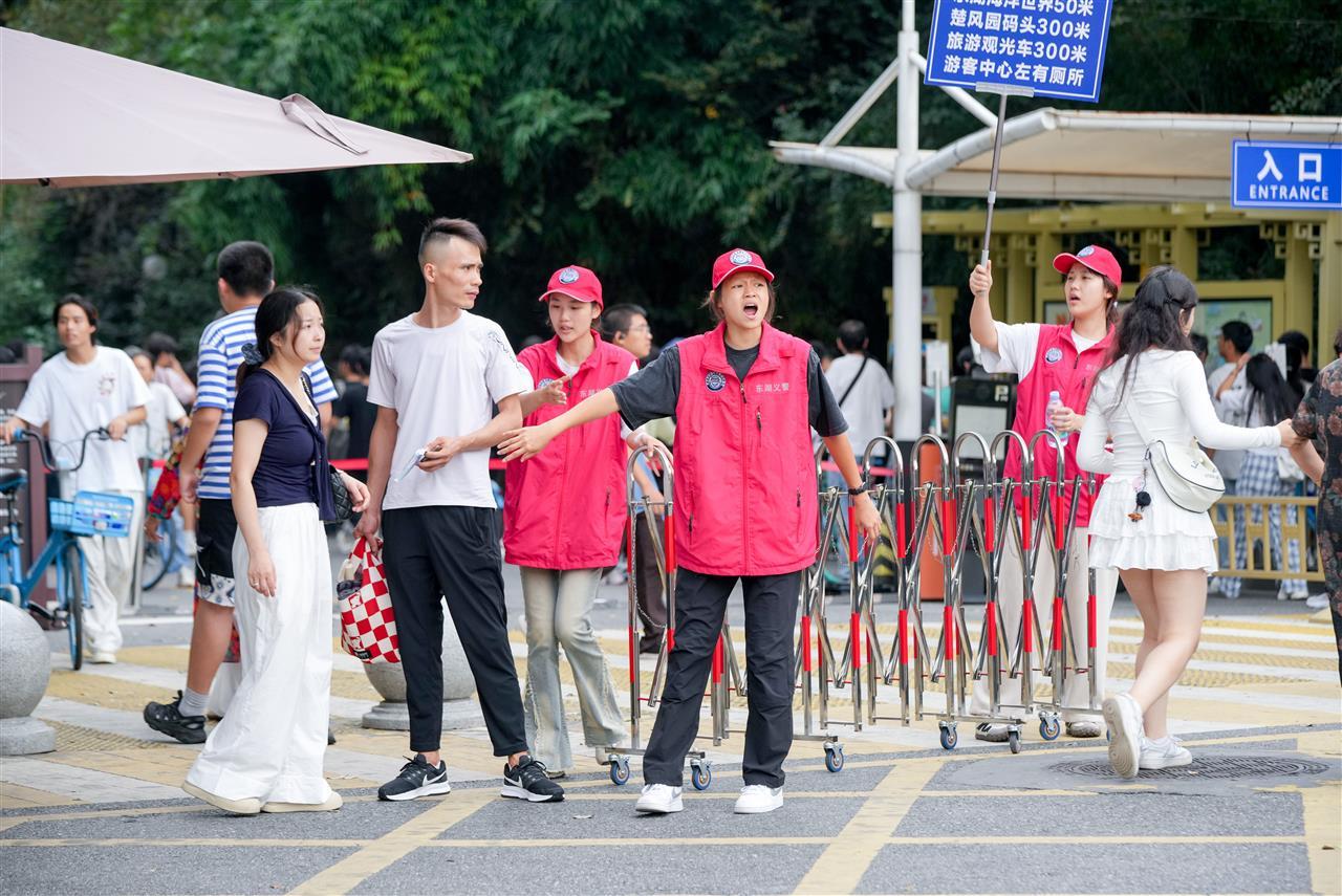 “能在国庆期间为来自全国各地的游客服务,我觉得特别有意义。”连续两天坚守岗位的大二女生王娈俐,是大学生义警队伍中的一员。她表示,虽然每天站立引导需要消耗不少体力,但看到路口通行顺畅、游客顺利入园,所有的疲惫都烟消云散,“这段志愿经历不仅帮游客解决了实际问题,也让我的社会实践能力得到了很大提升”。
