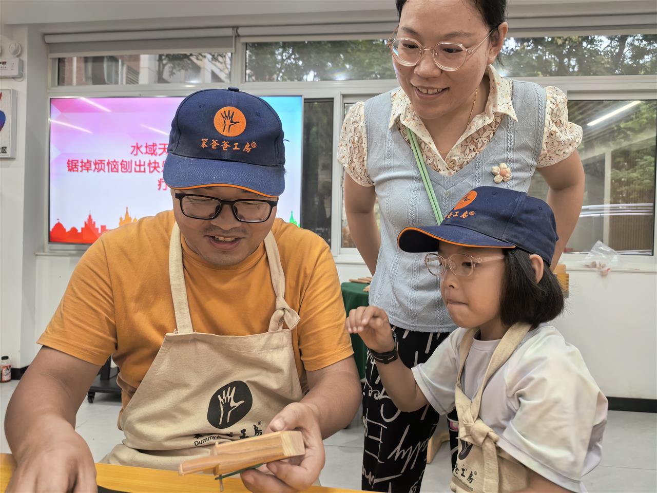 “大家看,这种活榫结构不用一颗钉子,也能让木料牢固拼接……”专业木工师傅手持木料演示传统技法,爸爸们纷纷俯身,仔细记下操作要点。
