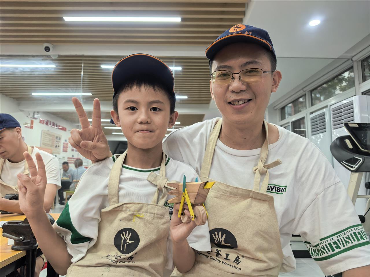 7岁的阳阳紧紧攥着木锯,在爸爸的手把手指导下,一点点将木料锯出缺口。当最后一块木头成功嵌入凹槽,摆件稳稳立在桌上时,他兴奋地拍手:“爸爸,我们做的摆件真的能站住。”稚嫩的声音里满是成就感,爸爸则笑着揉了揉他的头发,朝他竖起了大拇指。