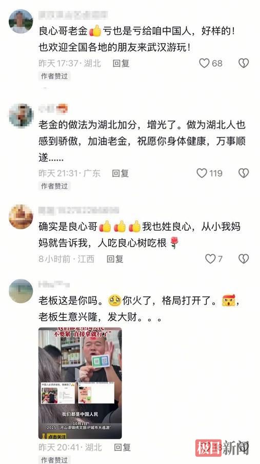 这份善意在网络上快速发酵,网友们的点赞中藏着更深的敬意。有人称其“用小举动传递大温暖”“这是武汉最暖的国庆记忆”,还有人喊他“良心哥老金”。