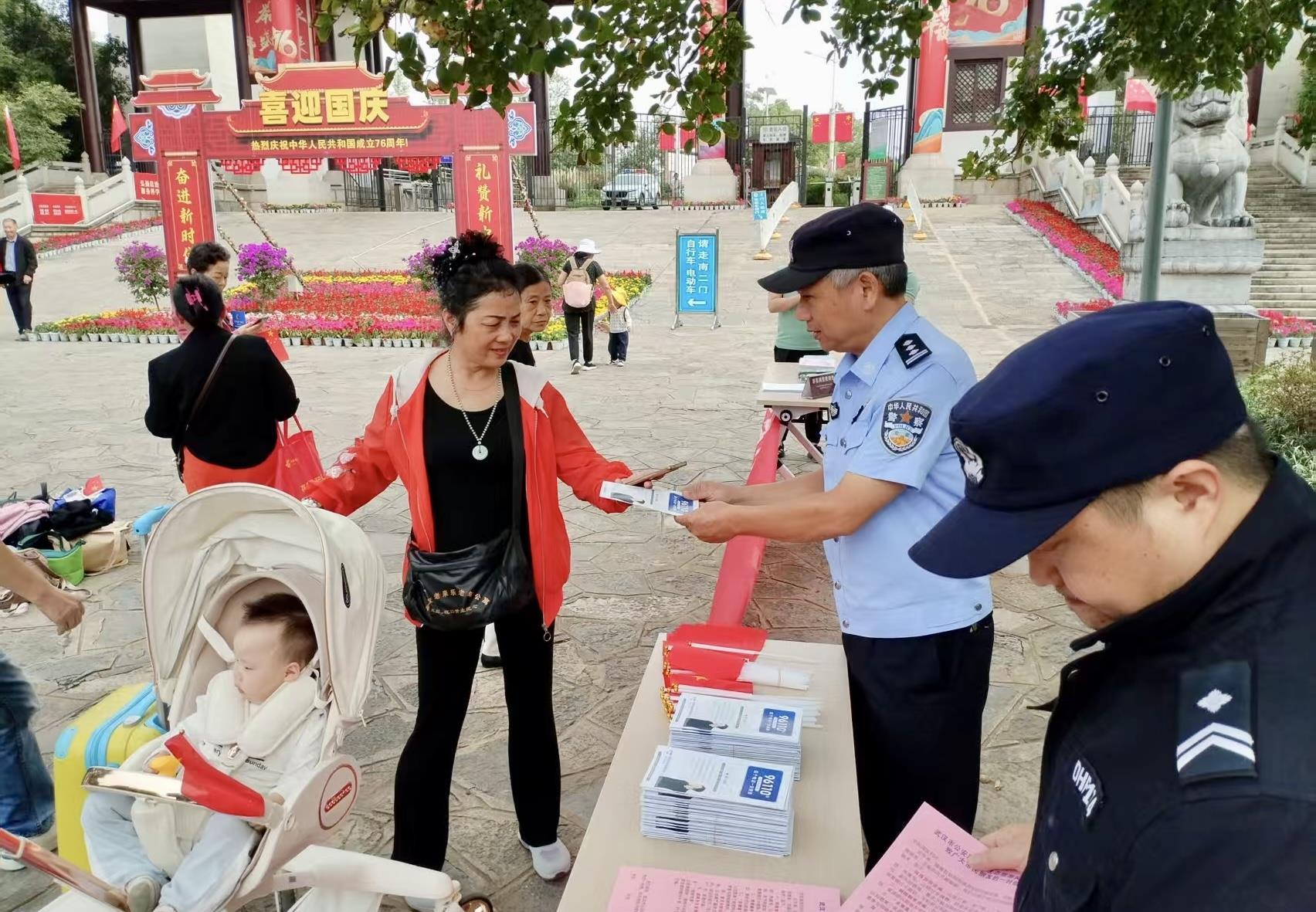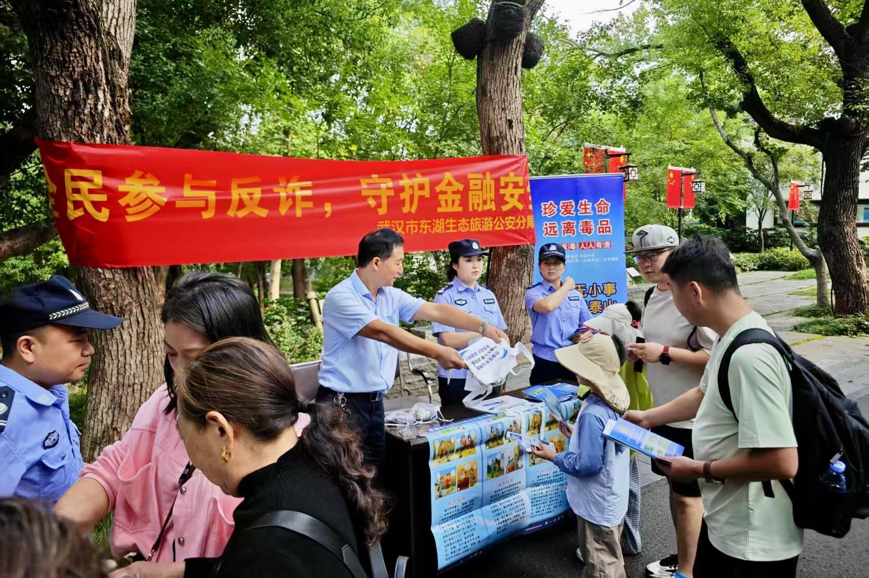 国庆假期,东湖风景区各大景区、公园迎来了客流高峰。为提升游客及市民的防骗意识,守护群众财产安全,10月3日吹笛派出所组织社区民警深入马鞍山森林公园、落雁景区等人员密集场所,开展“防骗反诈”主题宣传活动,为假期安全“加码”。