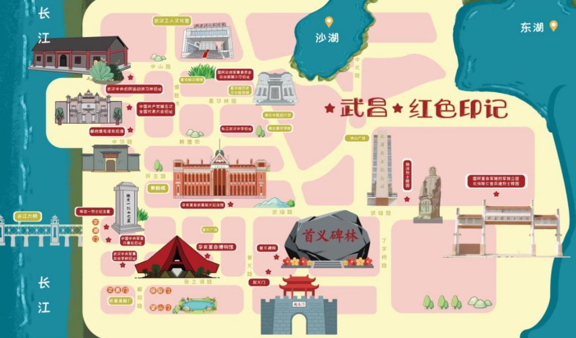 此次跨域协作的结晶——《武昌红色印记》手绘地图已于近日正式出炉。该地图由湖北大学青年学子集体创作,在武昌区红色文化资源的支撑下,以现代平面设计语言整合展现了武昌重要红色地标的风貌,成为一本兼具艺术性与教育性的“红色导览”,是红色文化与青春创意深度融合的生动载体。