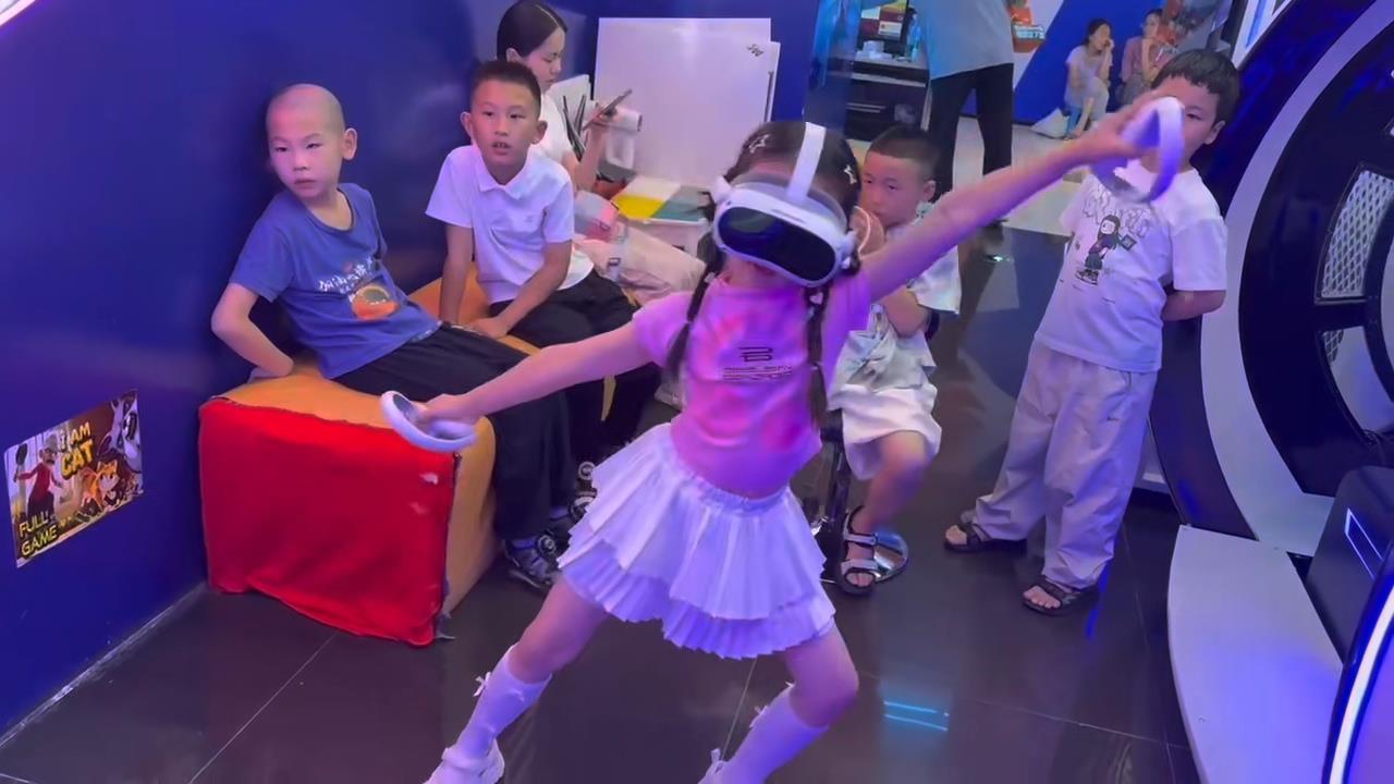 在另一侧的“时空穿梭机2.0”区域,5岁的瑶瑶正和妈妈一起体验《海洋奇缘》。随着设备启动,瑶瑶忍不住伸出小手,试图抓住从眼前游过的彩色鱼儿。“带孩子来这里,既安全又有趣。”瑶瑶妈妈表示,“这种体验比玩普通的游乐项目更有教育意义,海洋的场景能激发孩子对海洋世界的兴趣。”