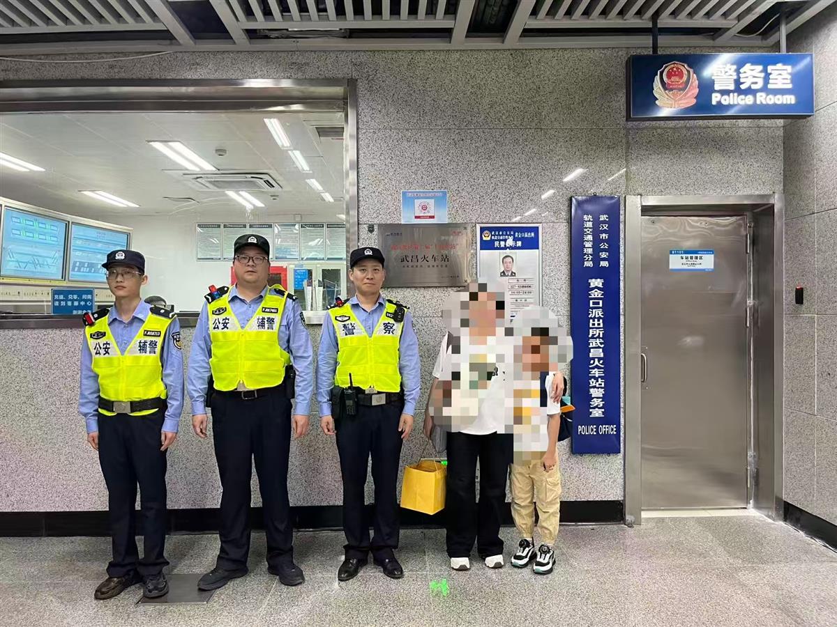 李振华、李猛、徐锦韬主动上前询问情况,提供帮助。原来,当天小男孩和妈妈一起乘坐地铁来到武昌火车站,打算返回老家麻城,因人多拥挤,一时不慎和妈妈走散了。民警辅警立即将小男孩带至警务室照看,耐心安抚其情绪,询问其父母联系方式,并通过车站广播发布寻人信息。经过多次尝试,民警辅警终于联系上小男孩的妈妈王女士。母子再次相聚的那一刻,王女士眼含热泪,连连道谢。