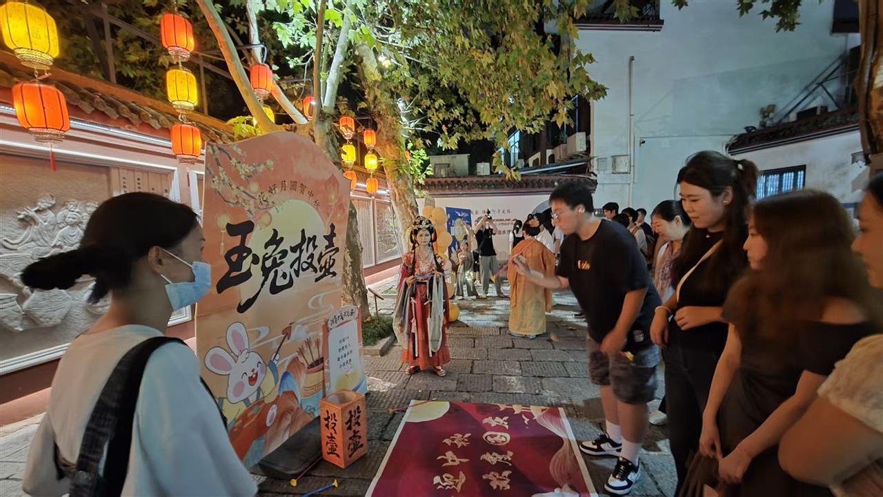 夜幕降临,晴川阁园区内灯笼高挂,游人如织。汉江与长江交汇处的晴川阁,自古就是文人雅士赏月赋诗的胜地。临近中秋,这座历史名园再次将传统与现代巧妙融合,让千年文化在月光下焕发新生。朝宗亭、禹碑亭、铁门关等处设有中秋民俗游戏体验区,诗词套圈、玉兔投壶等互动项目吸引了不少游客驻足参与。孩子们手提月灯,兴奋地穿梭在古阁回廊间。不远处,身着汉服的NPC在朝宗亭、禹碑亭、铁门关等景点进行乐器演奏,带领游客沉浸式穿越光影游园,体验传统文化魅力,这座历史名园以创新形式延续着中秋雅集的传统。