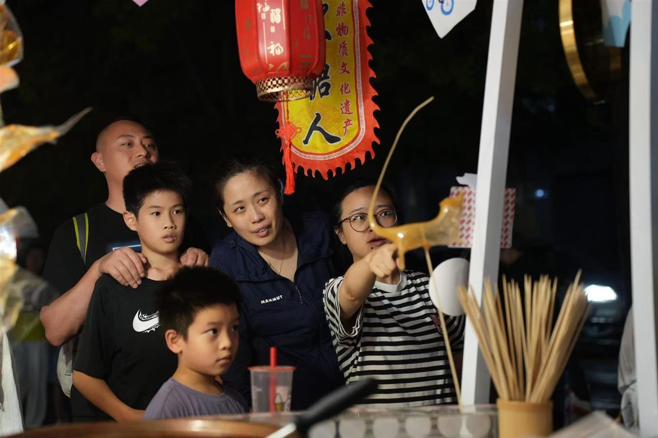 记者看到,非遗糖画摊位前,师傅手中糖勺翻飞,很快一只灵动的糖犬便引得孩童惊呼。
