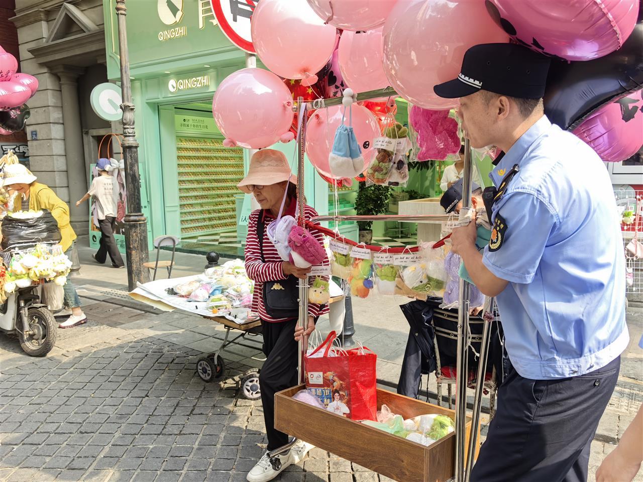随着游客渐渐增多,队员们也开始忙碌了起来。他们沿着风貌区内一路巡查,时而俯身整理乱停的共享单车,时而细心解答游客的问询。人流集中时,他们及时疏导,避免发生拥堵和安全事故;遇上流动摊贩时,他们耐心劝离,将其引导到不影响通行的指定区域。这种温和而专业的执法方式,赢得了商户和游客的广泛支持与好评。