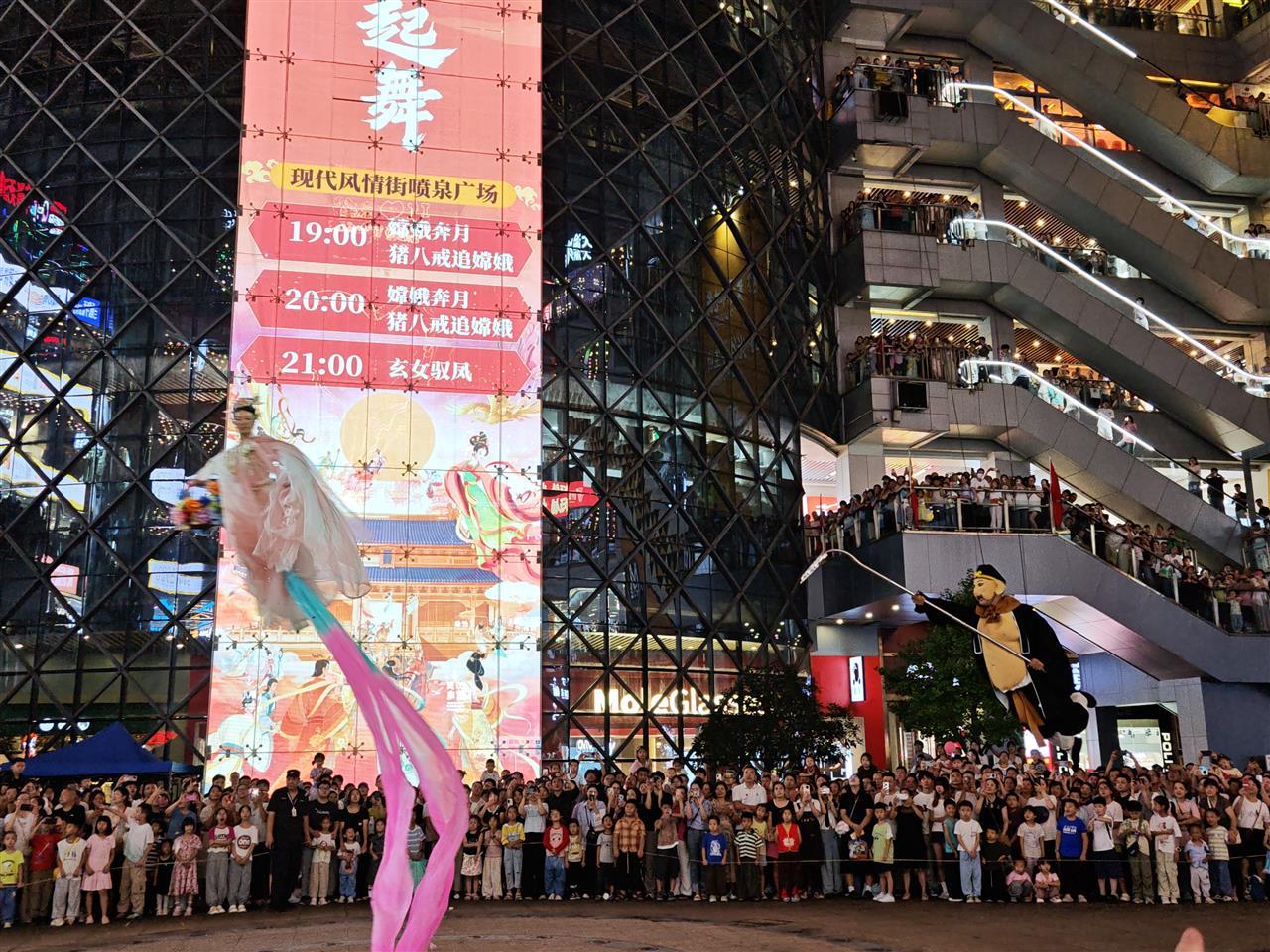 明月高悬,清辉洒落。10月6日晚,武汉光谷现代风情街喷泉广场上演了一场别开生面的中秋盛宴。当飘逸的“嫦娥仙子”从空中翩然降临,与皎洁明月相映成趣时,一个意想不到的身影闯入了这幅画卷——憨态可掬的猪八戒,以他独特的幽默与真诚,为传统中秋注入了全新的活力。