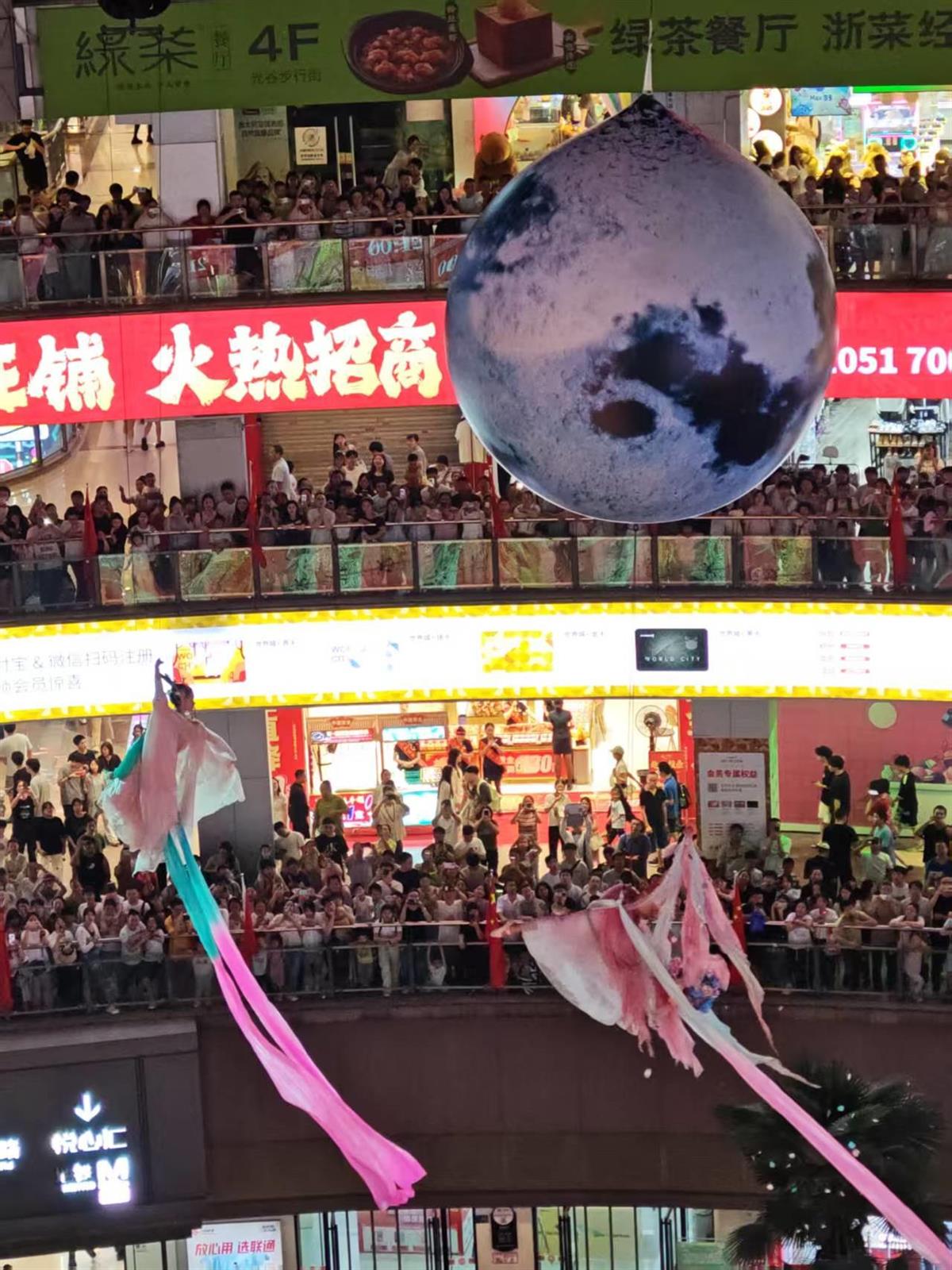 与此同时,在德意志风情街柏林广场,“仙女飞天”“嫦娥奔月”的空中表演同样令人惊艳。舞者身着彩衣,手持花瓣,在空中轻盈舞动,配合建筑上投射的绚丽光影,营造出如梦似幻的意境。东西方风情的双场演出,在这个中秋夜交相辉映,为市民游客带来了一场视觉与文化的盛宴。