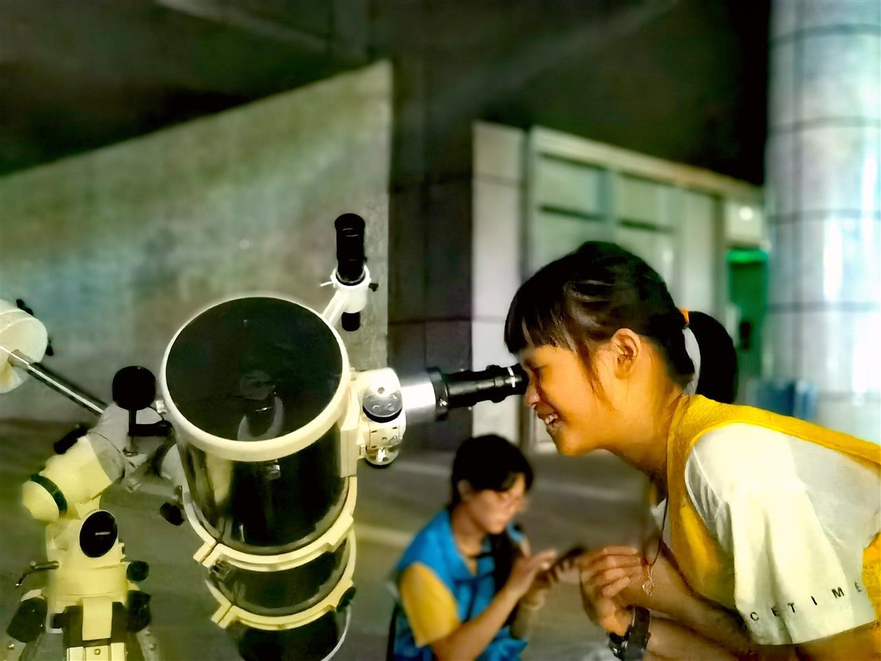 暮色四合,真正的“探秘”拉开帷幕。孩子们首先进入科普教室,了解关于月球的各种鲜为人知的知识。接下来,一架天文望远镜在广场上摆好,孩子们满怀期待地排好队,依次凑过去看月球环形山、土星环。