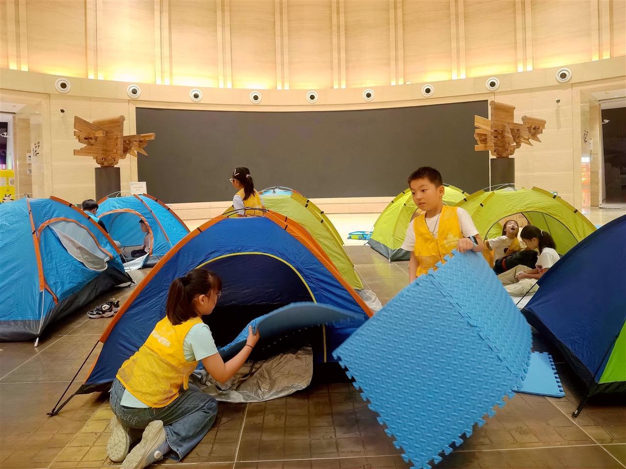 当日晚6时许,记者在现场看到,家长带小孩抵达博物馆、完成登记后,按要求离开,剩下的环节主要交给孩子们自己去探索。他们大多是小学二、三年级的学生,在带队老师的引导下,围坐成一圈,进行自我介绍,主动寻找当晚的帐篷“搭子”。