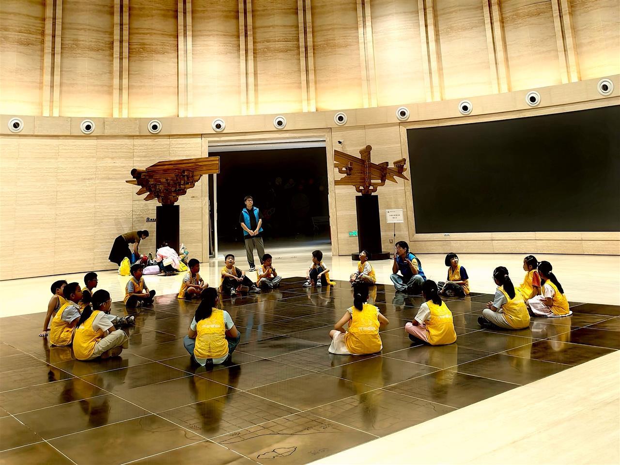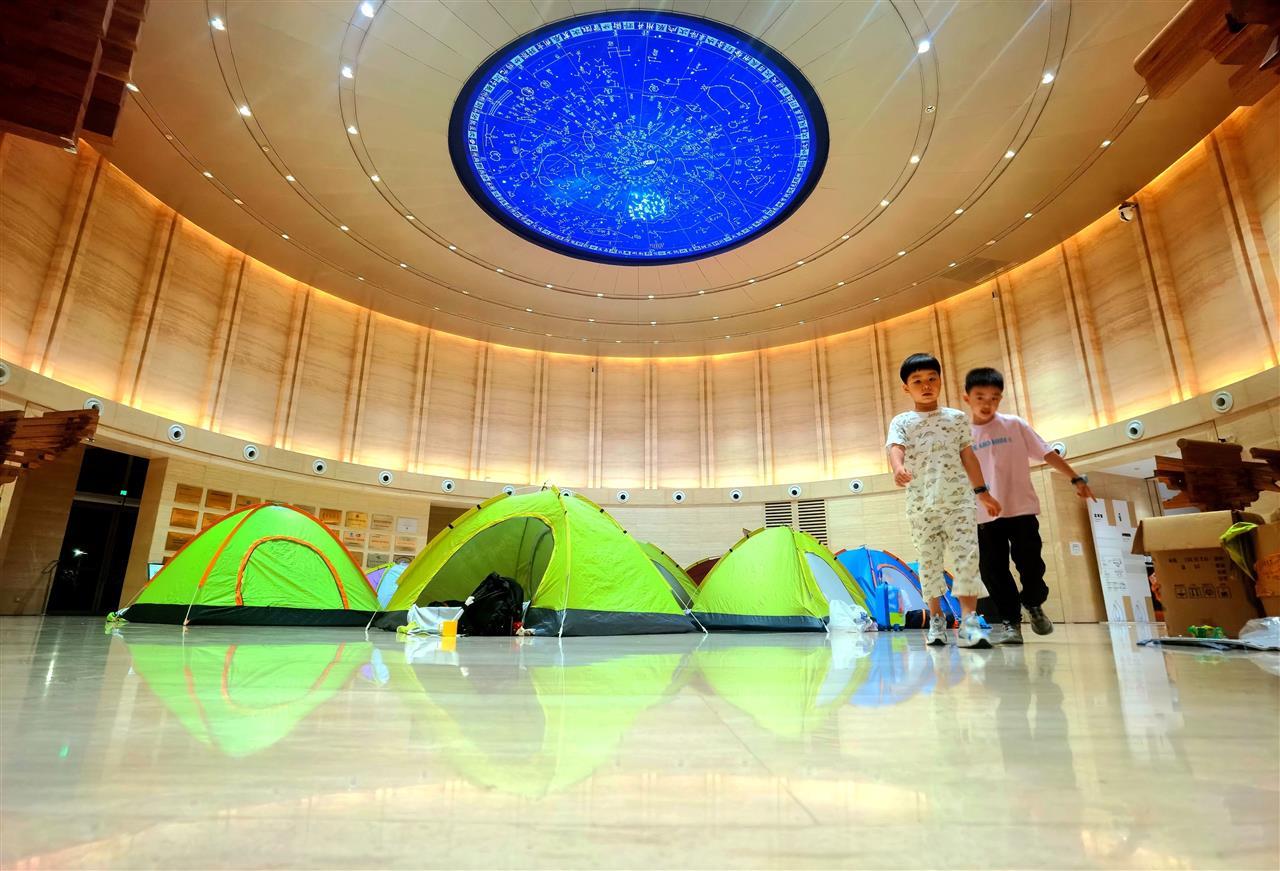 记者发现,帐篷搭建区域,正好是一处室内圆形大厅,顶部显示着中国古代的天文学成果《二十八星宿图》,而地面则嵌有我国现存最早的石刻地图之一《禹迹图》。孩子们刚看完星空,又夜宿在“星空”下。