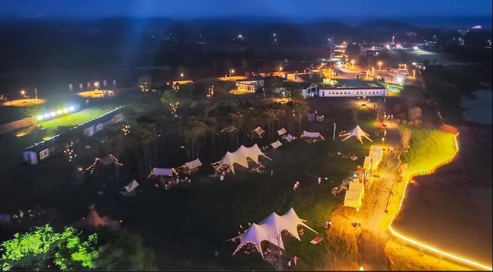 它用“潮流化表达”重新定义“远方”。首届鎏光电音露营节的举办,是点睛之笔。当白天在“虾趣奇妙岛”享受捉鱼摸虾的野趣,在“萌宠部落”与可爱的动物互动之后,夜晚的农场被鎏光舞台的电音和光束点燃。在星空下,帐篷串灯如梦似幻,动感音乐与自然之声交织。这种将田园牧歌与潮流电音融合的尝试,打破了人们对乡村“土味”的刻板印象:远方,可以是静谧的,也可以是热烈的,可以是怀旧的,也可以是新潮的。