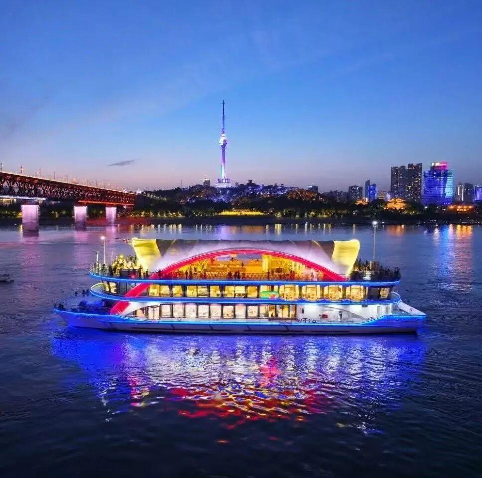 武汉“两江夜游”船票一票难求,组成“中国红”主题船阵,让“中国红”在长江上迎风飘扬,勾勒出一道道流动的红色风景线。