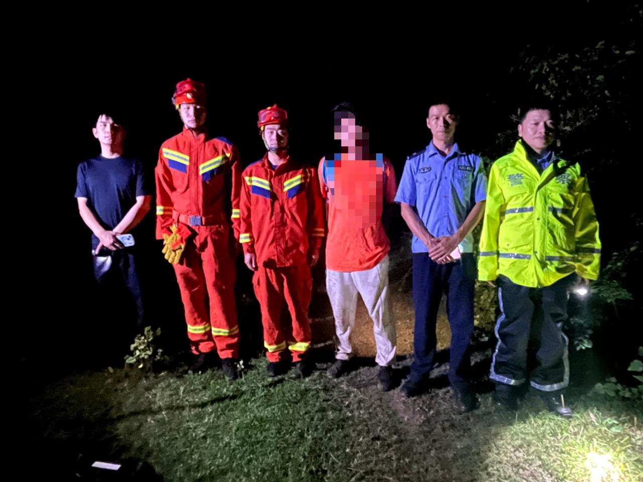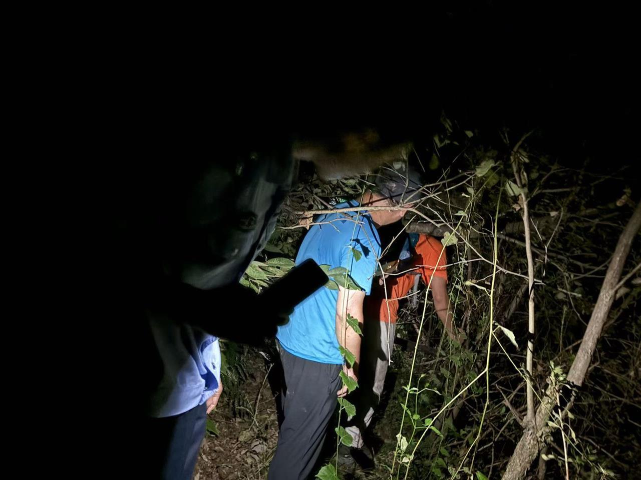 天色渐暗、林密雾浓,周茹韬在密林高处率先听到微弱应答,队员循声前进,于21时许在水塘边找到被困者。经检查,驴友仅体力透支,无外伤。补给后,队员护送其下山并移交家属。家属激动地连连道谢。