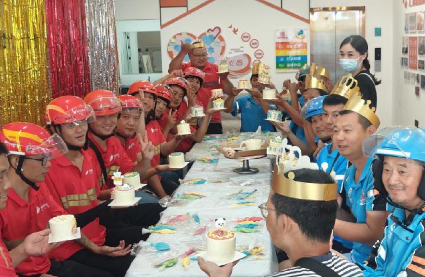 当天清晨,智慧小哥公寓内已是热闹非凡。社区工作人员早早布置好场地,彩球轻摇,笑语声声。长桌上摆满了红彤彤的苹果、金灿灿的柚子和清凉的饮料,最引人注目的当是中央那个写着生日快乐的蛋糕——这是社区为常年穿梭于风雨中的骑士们精心准备的惊喜。