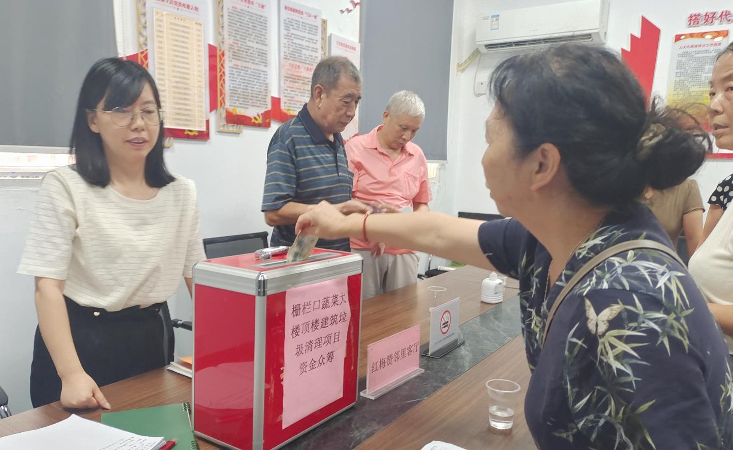 为解决居民急难愁盼问题,梅隐寺社区坚持把小区共治融入基层党建工作,组建了“红梅赞”志愿服务队伍,通过“梅好院落同心会”议事协商平台,让居民群众“唱主角”,引导居民代表们民主协商化解难题,与群众共同确定了蔬菜大楼楼顶环境卫生整治共治项目,梅隐寺社区党委和“红梅赞”志愿服务队员带领群众自发参与小区事务共商共议项目方案,想办法筹集项目资金,经过协商,居民群众最终决定采用“居民众筹经费+以奖代补资金”的方式筹集项目经费。
