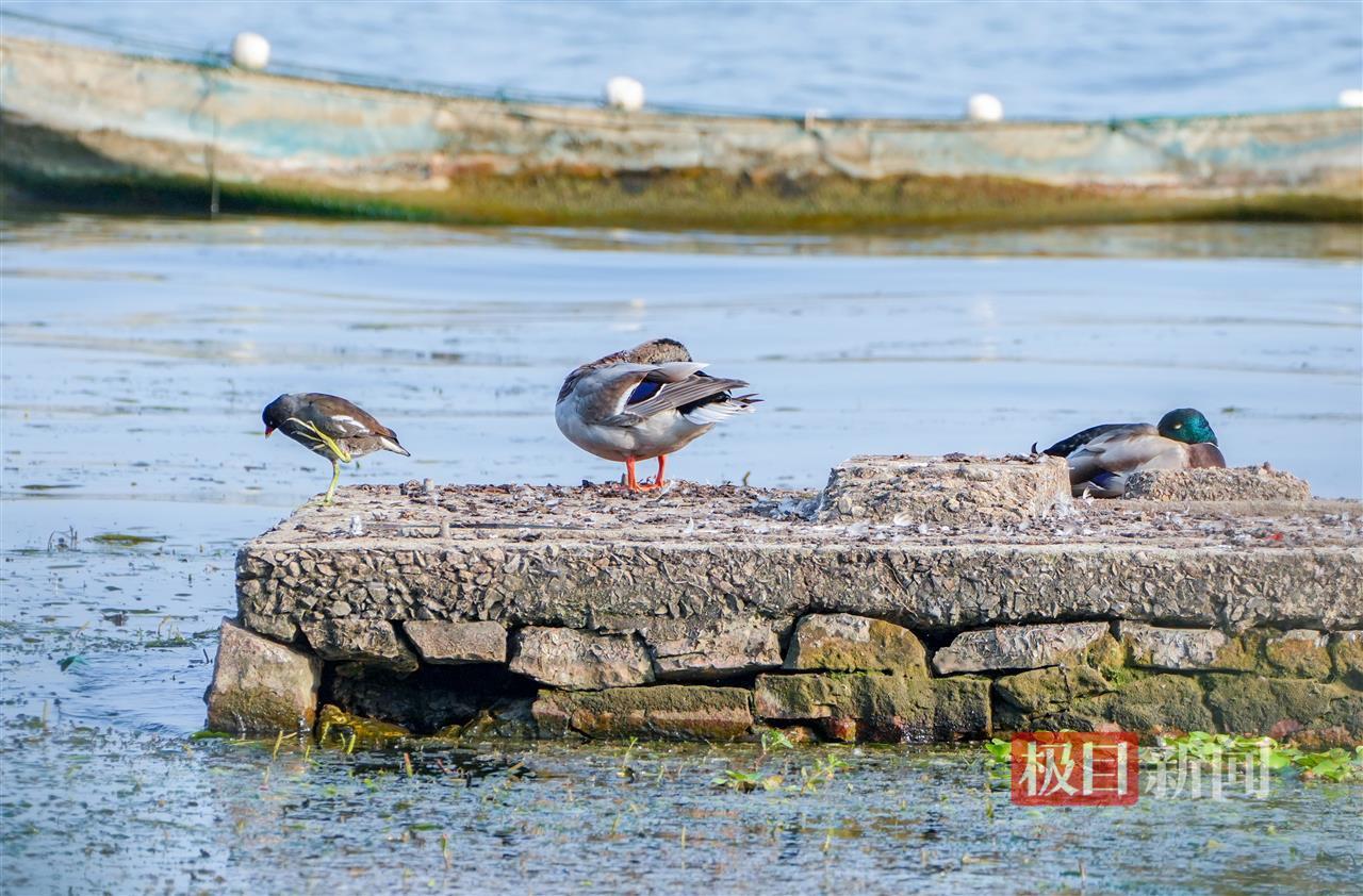 最引人驻足的是一处约2米长的水泥砖石板上,1只黑水鸡与4只绿头鸭并肩而立,各自低头修整羽毛,互不打扰,画面格外温馨。难得的是,这些水鸟与岸边距离仅约10米,即便有游人往来经过,它们也丝毫不受惊扰,依旧自在活动。