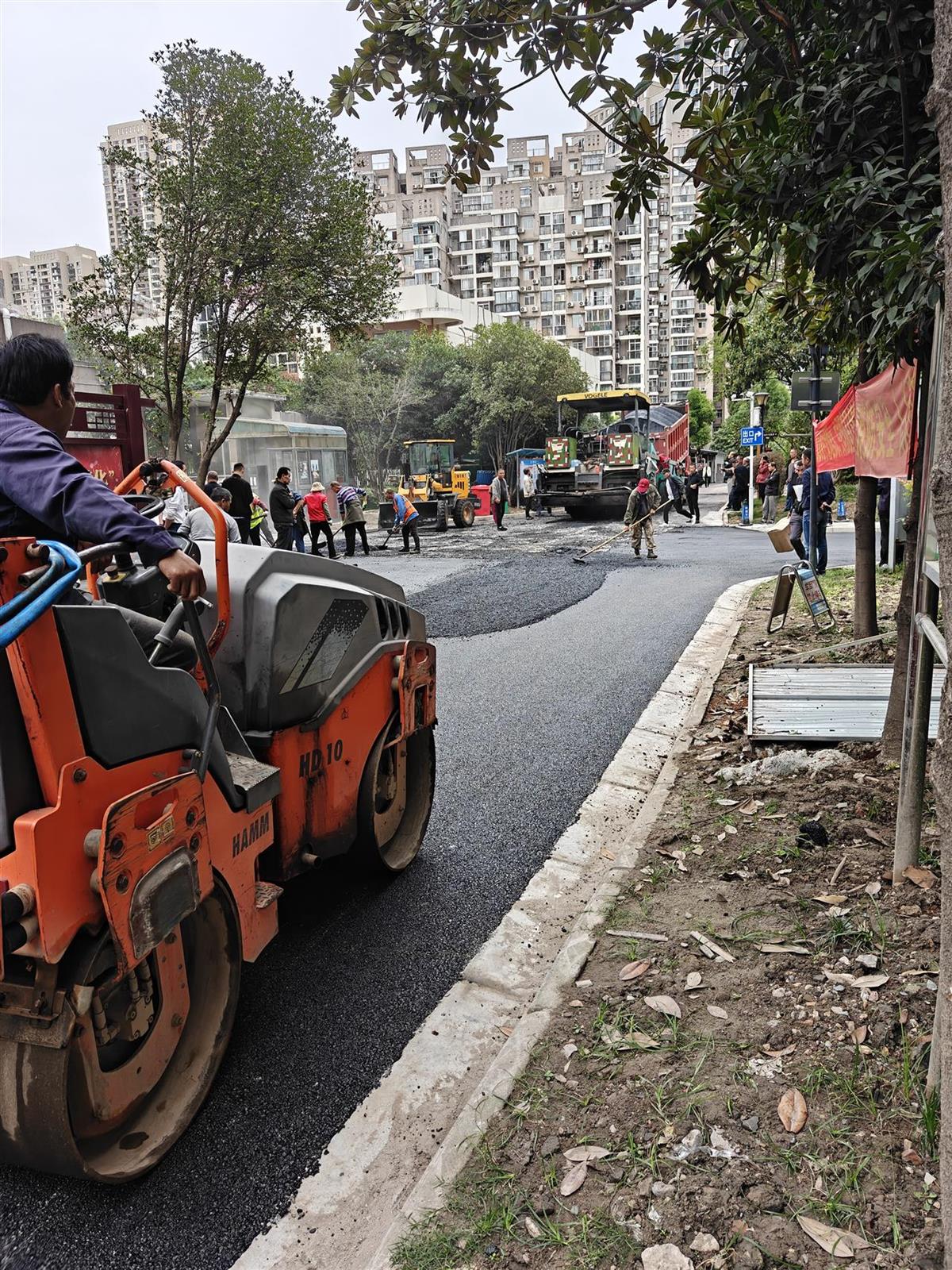 新闻记者赶到事发地武汉百步亭景兰苑小区。刚进入小区,记者便注意到小区道路刚刚铺完沥青,顺着道路前行不远,记者发现路口已被施工围挡打围,围挡内,压路机、沥青洒布车等工程车辆正在作业,机器轰鸣声不止。一旁还有施工人员现场指挥。