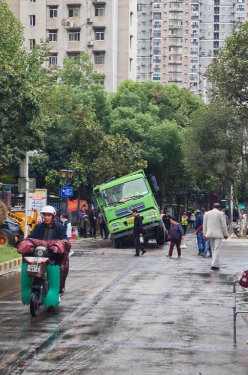 10月13日上午,武汉市江岸区百步亭景兰苑小区内,一辆满载铺路材料的大货车右后轮陷入地面,左前轮翘起,引起居民围观。