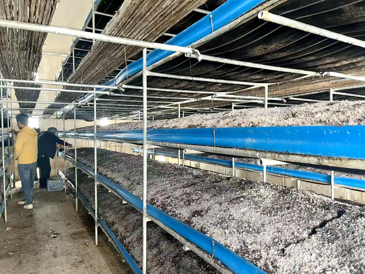 上午10时许,记者走进周湾蘑菇科技示范园,20个白色标准化菇房整齐排列,每座棚内都配备了智能温控、喷淋系统,村民正有条不紊地进行上料、松土等工作,他们动作娴熟,全力以赴为月底的采收做准备。