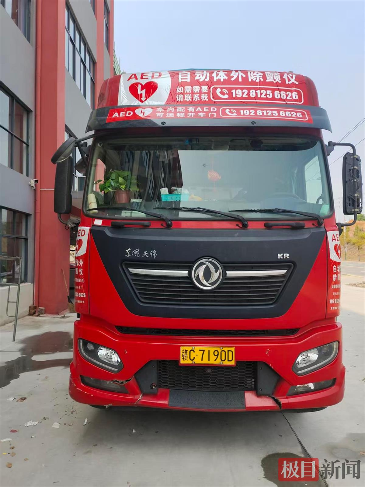 10月13日,记者联系上这位爱心车主陈文剑。来自江西省宜春市丰城的他,是一名退役军人,如今从事货运行业。陈先生透露,他已自费为名下的3辆大货车全部配备了AED设备,并特意将仪器放置在驾驶室,方便紧急时快速取用。为让救援信息更加醒目,他专门出资在车头上方绘制了醒目的标语,定制彩绘的雨棚布罩在车身上,上面写着“退役军人,如有需要招手即停”“此车已配备心脏除颤仪AED”等醒目的标语,无声地向过往司乘传递着安全承诺。