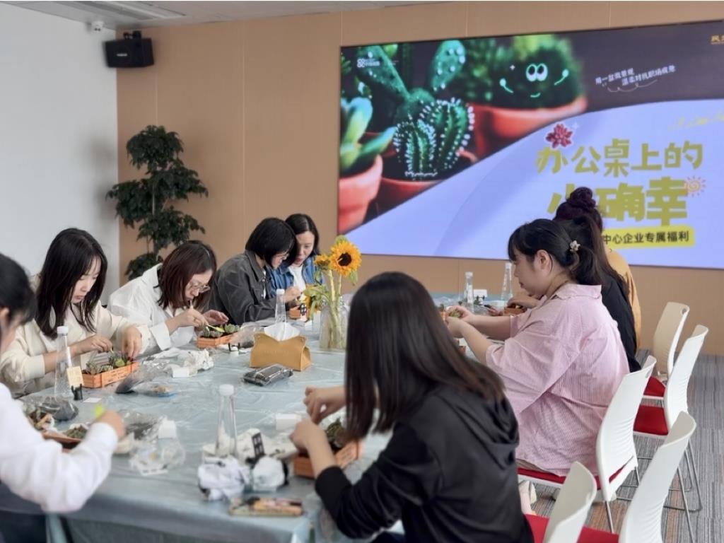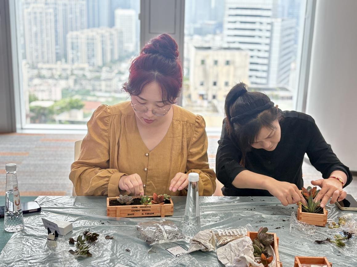 活动现场,参与者在专业老师指导下,将形态各异的多肉植物与精巧饰件自由搭配,于方寸之间打造出一个个生机盎然的迷你花园。不同企业的员工在这场创意手作中自然交流,从种植技巧聊到工作日常,现场氛围轻松融洽。