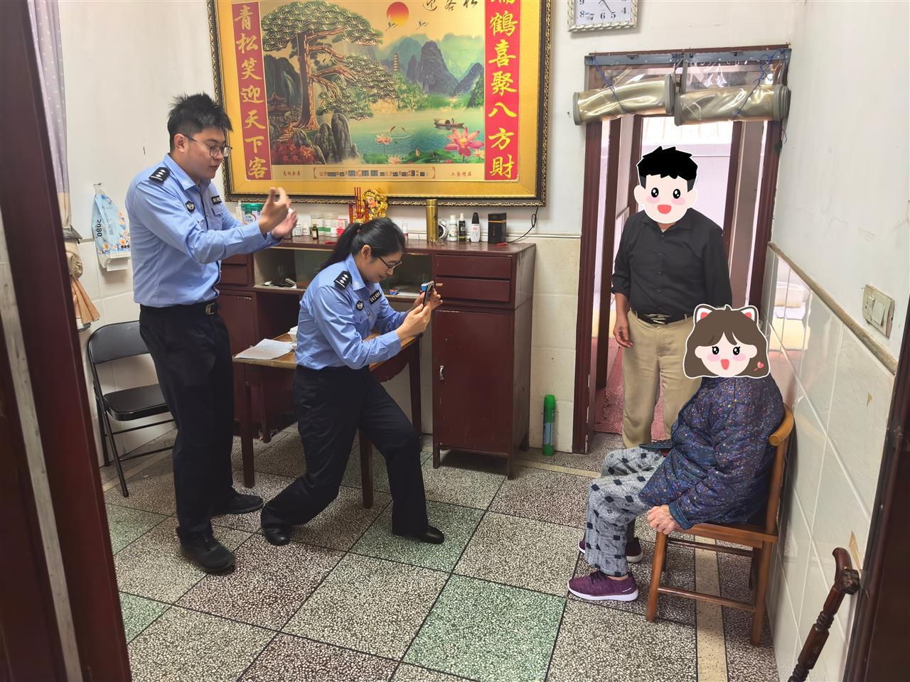 考虑到工作日窗口业务繁忙,为避免影响其他群众办理业务,许文华决定利用中午休息时间上门服务。12点10分,许文华携带好办证设备,如约来到了夏先生家中。此时,堂屋里的凳子已经摆好,年迈的老人也在家人的搀扶下坐到了客厅的白墙前。许文华和张晓立即上前,细心地帮助老人整理衣物,轻轻协助老人调整坐姿,确保拍摄效果。