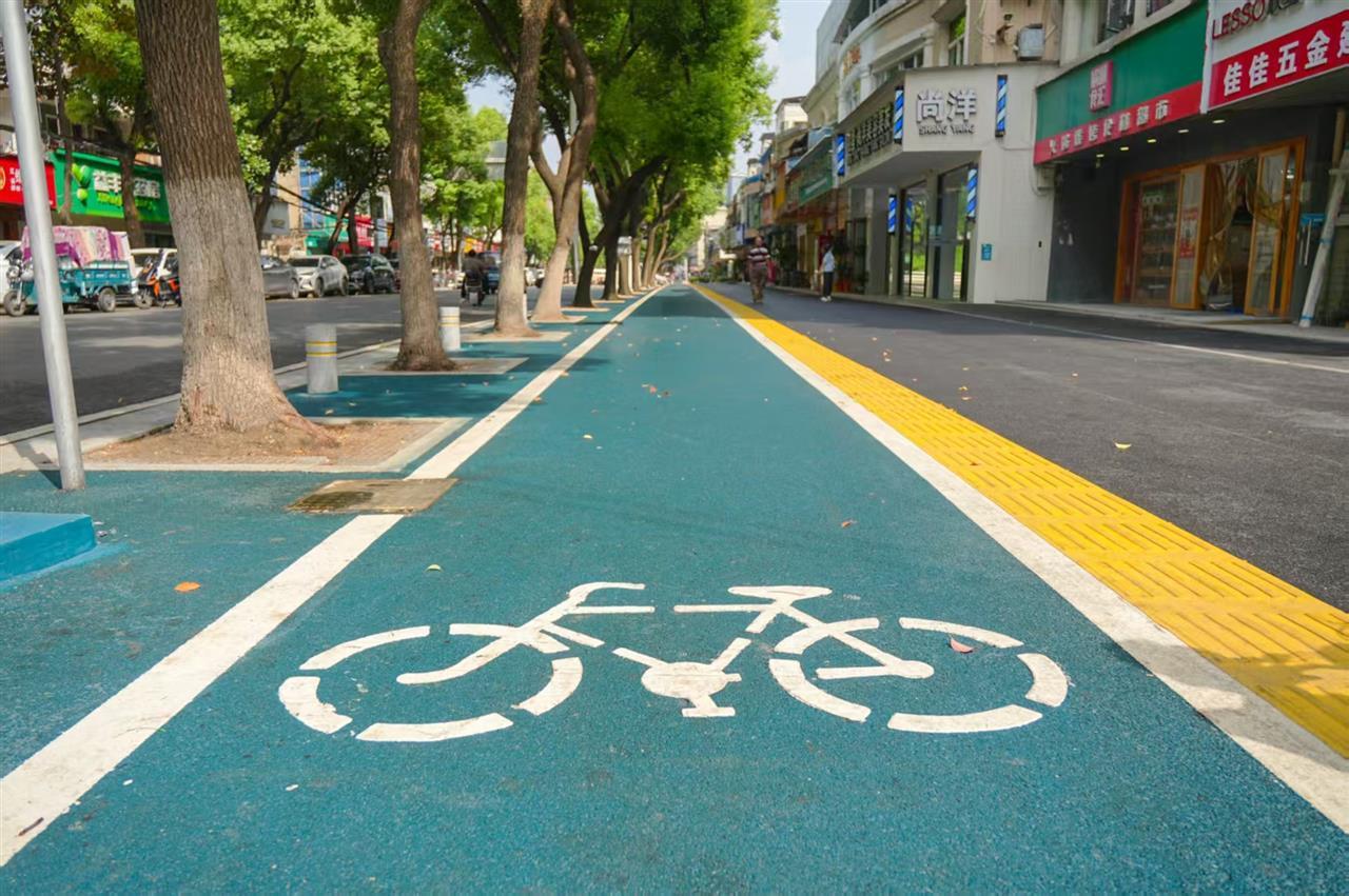 4700平方米旧地砖全部拆除后,施工队铺上彩色沥青——人行道黑色、非机动车道酞青蓝,两种颜色通过白色标线清晰分隔。紧挨着白色标线的是亮黄色盲道,在施工中摒弃传统砖材,创新采用无机高强聚合材料,现浇即用,有效减少施工对行人的影响,实现降本增效。此外,针对沿街商户门前自建台子高低不一、材料杂乱的问题,采用花岗岩砖统一铺成1.2米宽的台面,与沥青路面无缝对接,更平整美观了。