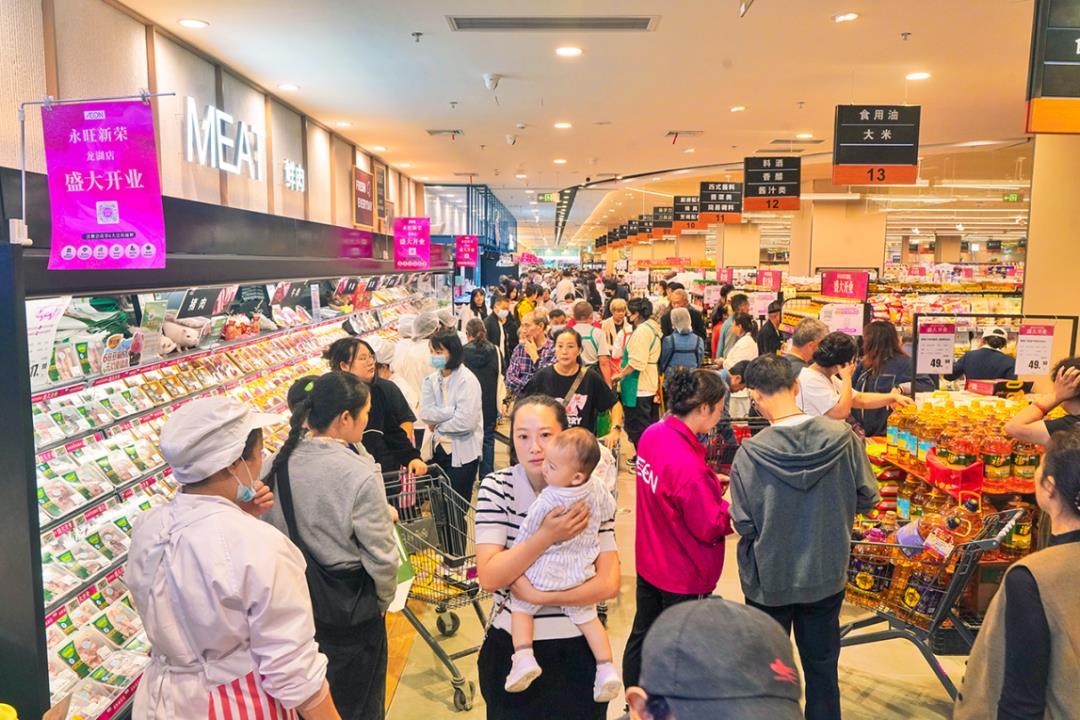 在B1层的永旺超市,一个个货架前围满了顾客。新荣龙湖店是永旺湖北在汉开设的第12家店,以食品超市(SM)业态进驻该购物中心。在地理位置上,靠近后湖大道和解放大道两条大汉口的城市主干道,武汉地铁1号线和阳逻线双线在此交会,新荣地铁站F口、G口,出站即可直达,交通便捷。作为扎根地区,服务于后湖的中高端超市,不但填补了该区域大型商超的空白,还可辐射周边30万居民。