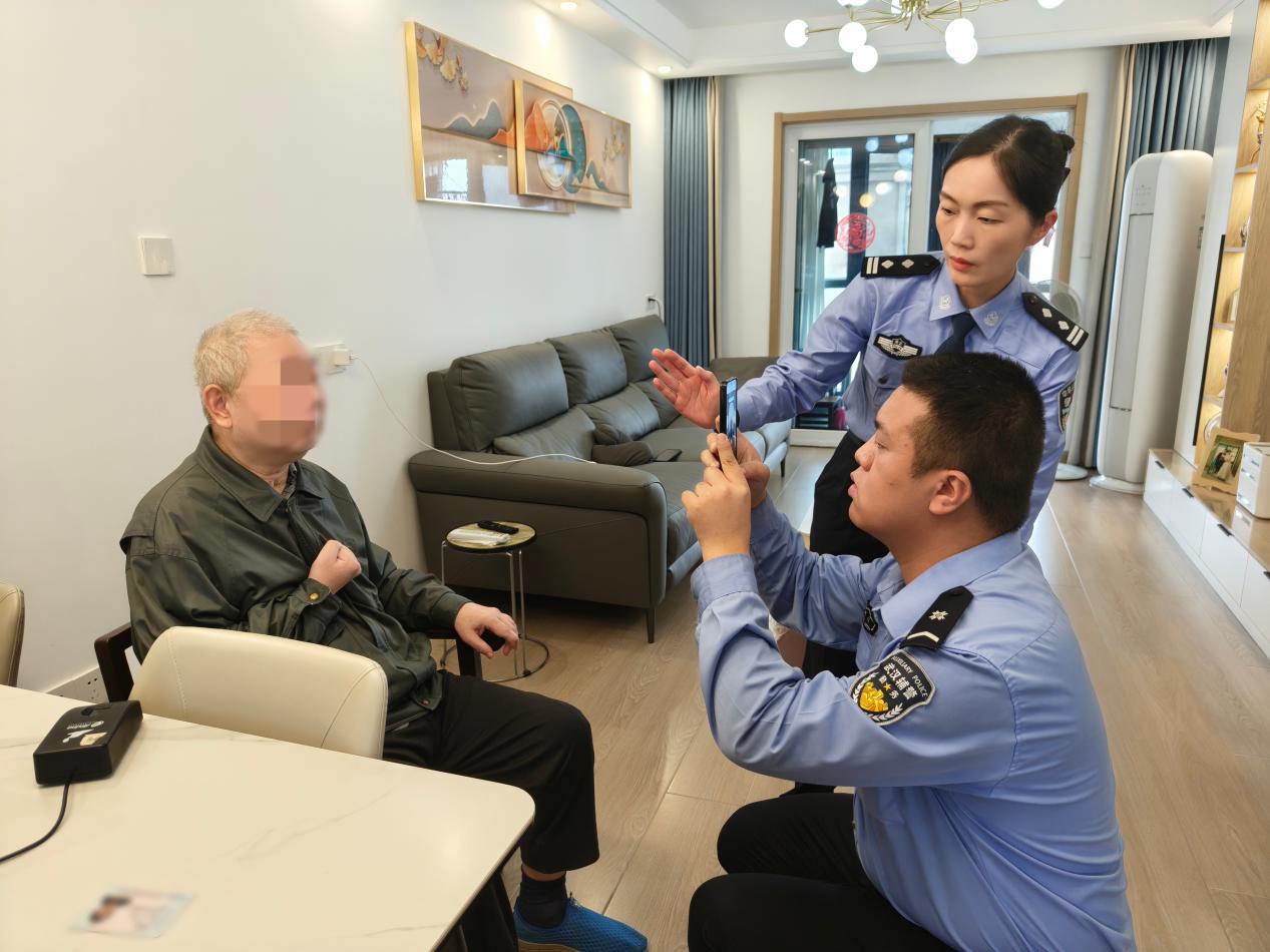 10月16日下午,团队民警吴军、辅警李欢接力开展服务。在正义路,针对右手无法张开的程爹爹,两人灵活调整采集方式,顺利完成业务受理。在江岸区社会福利院,面对长期卧床无法坐立的林爹爹,民警吴军与家属密切配合,反复调整拍摄角度与光线,最终采集到合格人像。随后为住院配合度较低的徐先生服务时,吴军以对待孩童很有耐心,用简单话语反复示范,全程微笑引导其完成拍摄及指纹采集,其家属连连称赞。