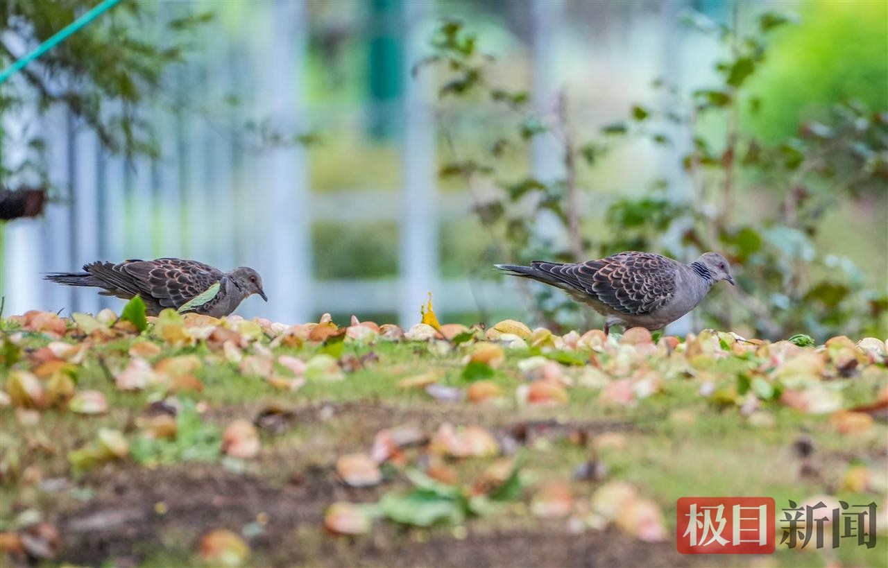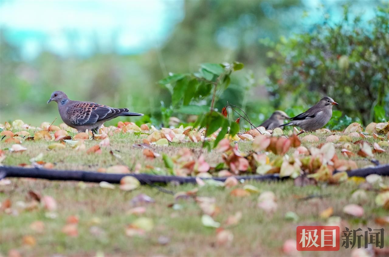 当天下午,新闻记者在该园C区看到,松树、樟树、乌桕树、栾树等枝头挂满即将成熟的果实,成为林鸟的天然“粮仓”。斑鸠、丝光椋鸟、灰喜鹊、乌鸫等林鸟纷纷现身,有的轻盈跃于枝头啄食,有的则成群结队在树下捡拾掉落的果实,叽叽喳喳的鸟鸣声打破了园区的宁静。