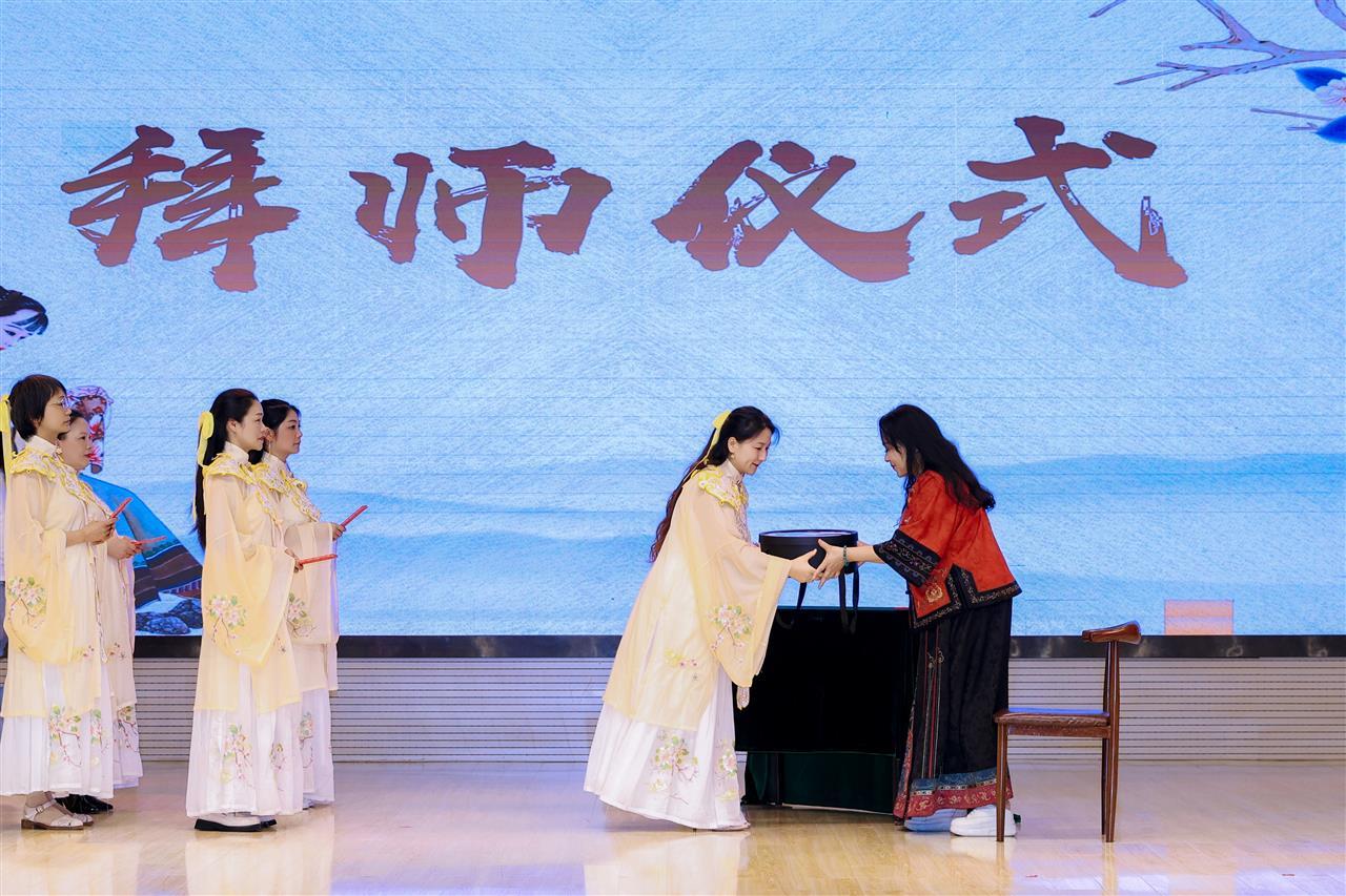 活动现场,国家非遗汉绣传承人黄春萍身着亲制的汉绣马面裙,端坐主位接受弟子拜师。15名社区绣娘代表集体宣读拜师帖,行三鞠躬礼敬茶,黄春萍逐一赠予回徒贴与绣针,并寄语“先修德、后习艺,守正创新”。