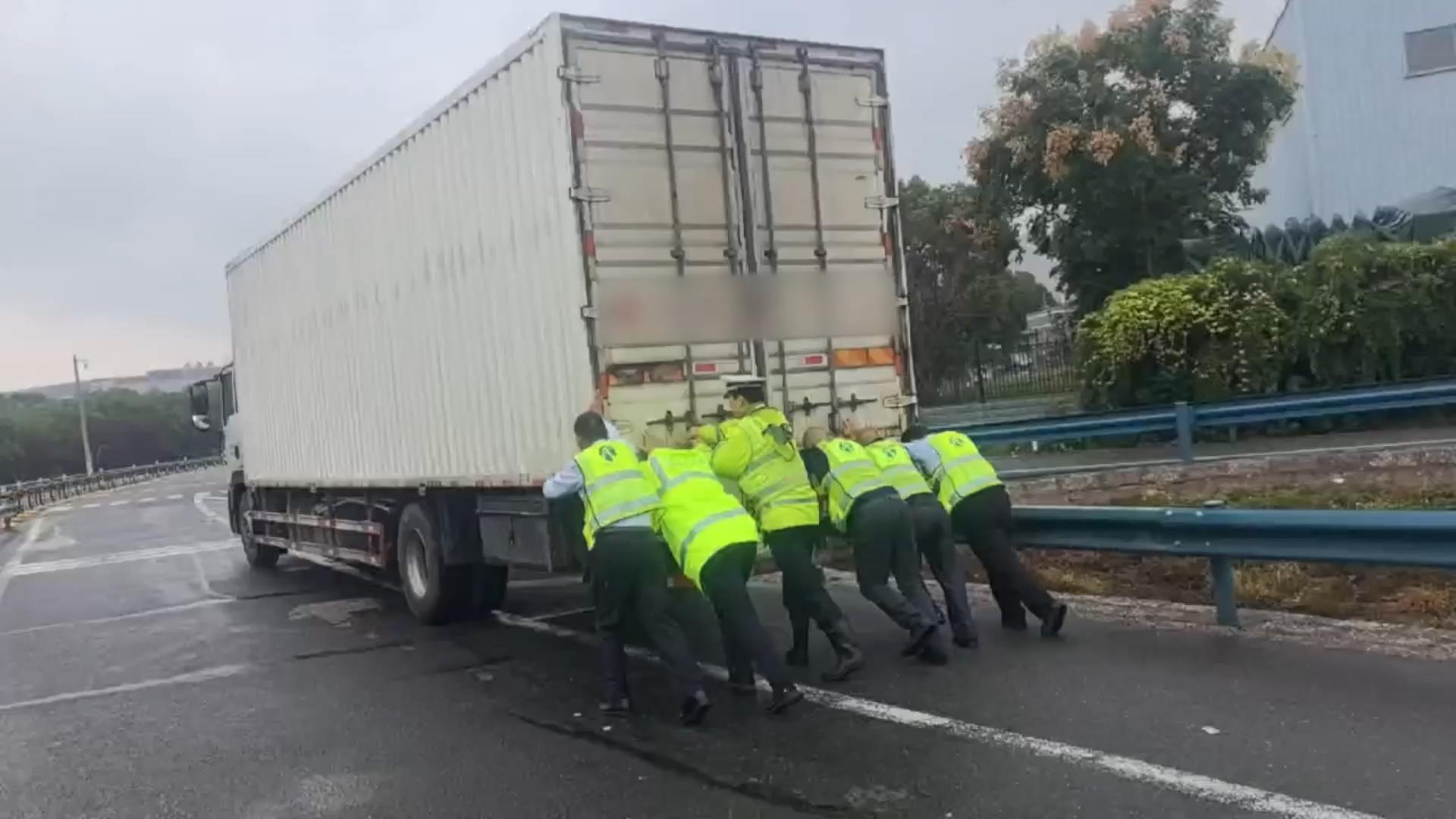 10月18日16时45分,在武汉绕城高速柏泉收费站出口匝道,一辆重型货车因故障抛锚,堵死了行车道和应急车道。眼见马上就要到下班车流高峰期,出口匝道已经形成车辆滞留,湖北高速交警蔡甸大队民警巡逻到此,立即行动,联合收费站工作人员徒手将重型货车推出收费站。3分钟后,匝道恢复了畅通,过往司机纷纷给民警和收费站工作人员点赞。