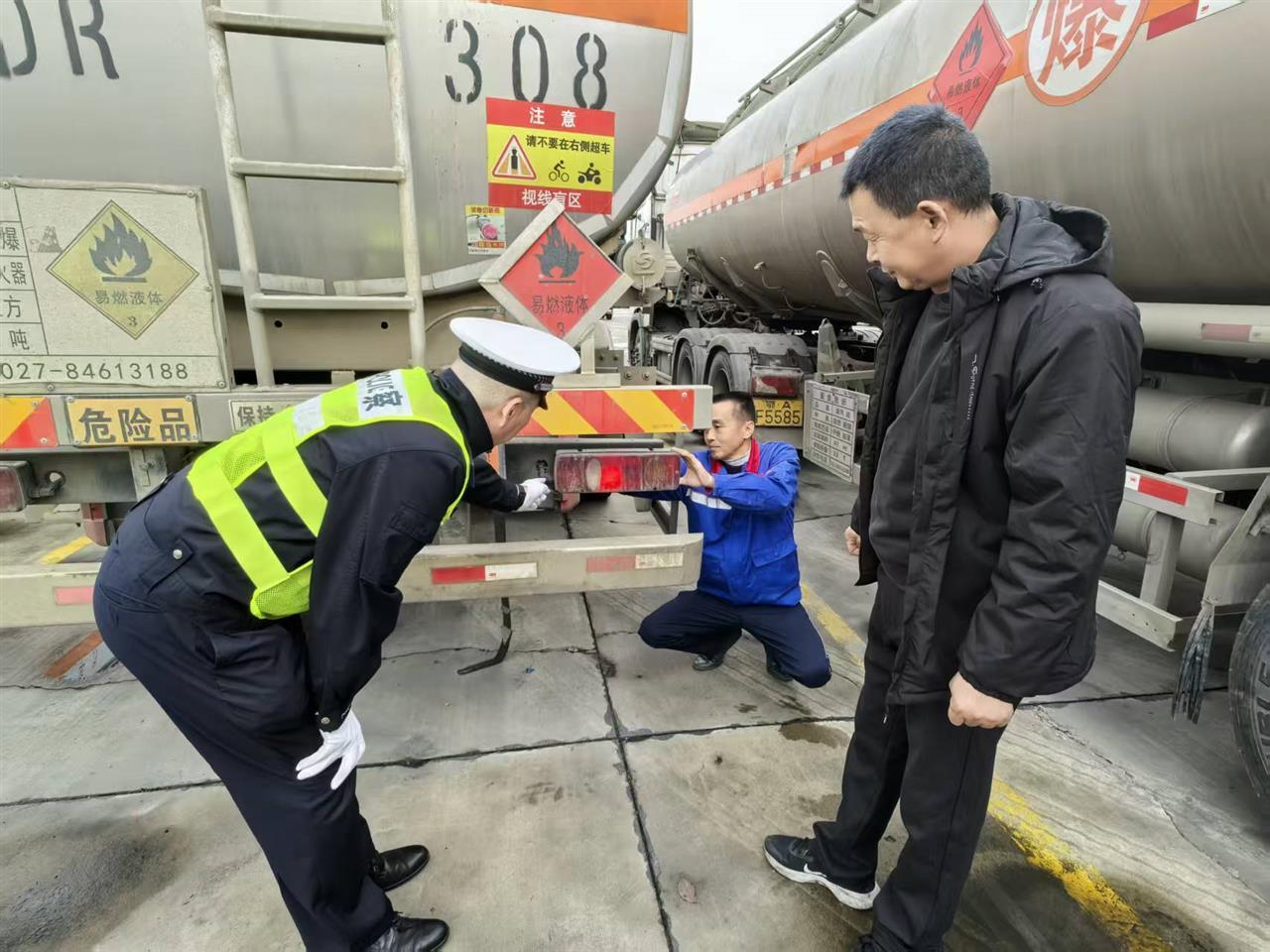 民警章驰对该公司10辆危化品运输车进行仔细检查,重点围绕车辆制动系统响应灵敏度、轮胎磨损情况、危险品警示标识是否清晰规范等关键环节展开核查,并逐一测试了灭火器、三角警示牌等随车应急设备是否齐全有效。
