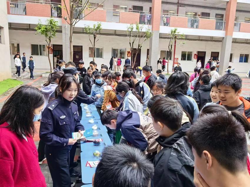 广播余音未落,教学楼前的禁毒宣传展台已人头攒动。仿真毒品模型、禁毒宣传手册、专业讲解员……丰富的形式瞬间点燃了学生的参与热情。民警张慧手持一盒新型毒品模型,向围拢的学生们揭示其隐蔽性:“它们可能穿着奶茶、跳跳糖、‘电子烟’的‘迷彩外衣’,潜伏在日常生活中。”学生们俯身细看,惊叹声此起彼伏:“原来这么危险!”
