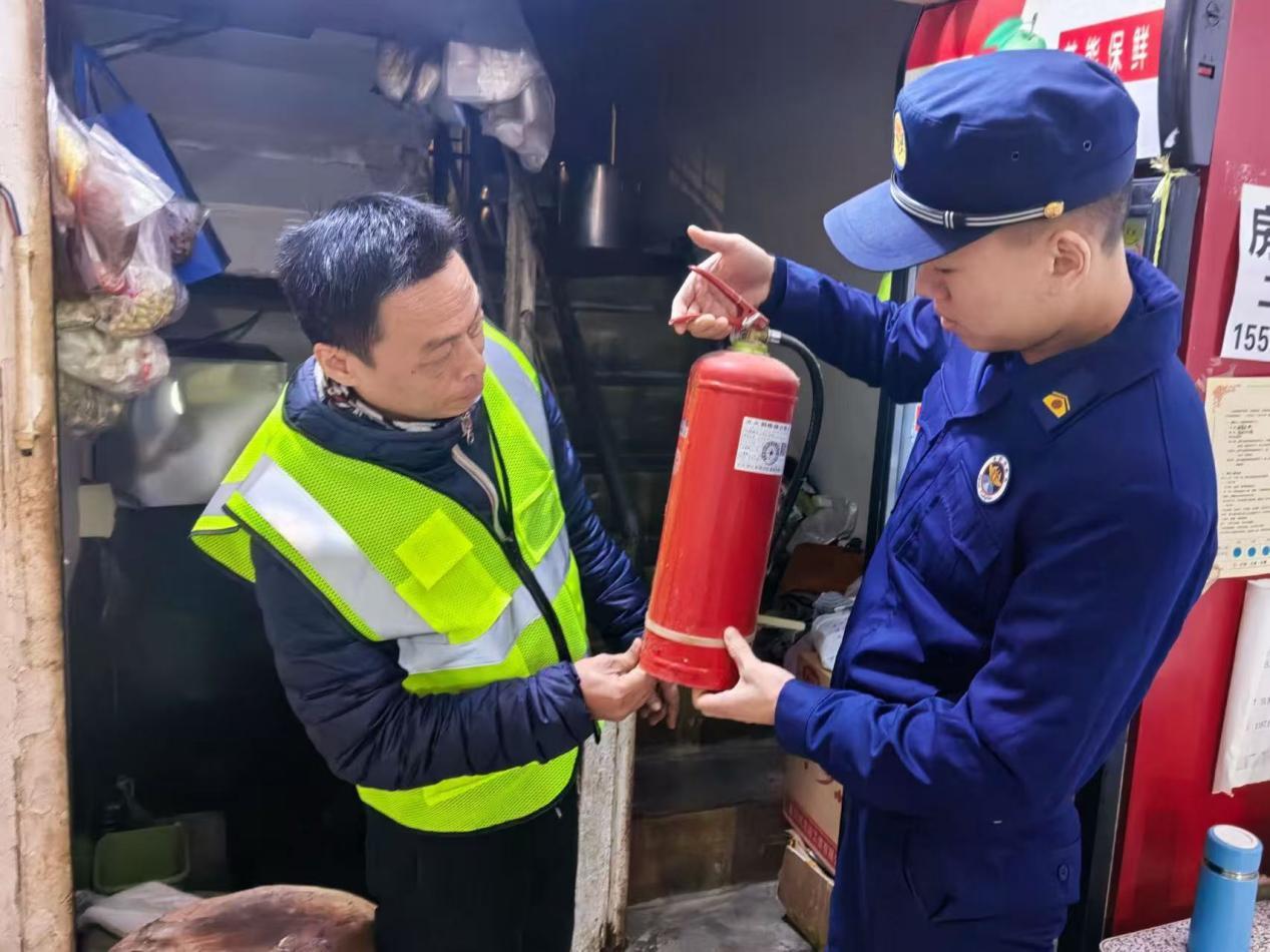 在武昌区,巡防组主要对沿街商铺及居民住宅小区开展消防安全集中夜巡行动。重点围绕各门店的疏散通道、安全出口是否畅通,外窗是否违规设置影响灭火救援和疏散逃生的铁栅栏、铁丝网、广告牌,是否存在“三合一”违规住人现象,“上店下宅”场所的防火分隔措施是否落实到位,以及灭火器等消防设施设备配备等情况进行重点检查。巡防组随机抽查了灭火器,观察零部件是否齐全且无松动、脱落或损伤现象,以确保消防设施随时处于可用状态。同时,通过现场演示灭火器、消火栓的正确使用方法,向商户普及消防安全知识,提醒商户定期开展自查自纠,切实增强消防安全意识和自防自救能力。