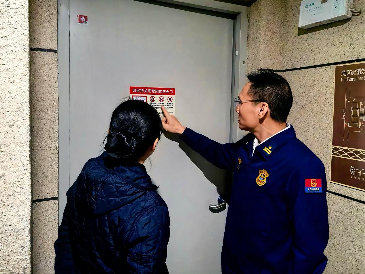 “这是常闭防火门,日常应保持关闭状态,小区日常要加强对防火门的检查与管理。”在硚口区,巡防组先后前往翰林珑城、鑫奥琳医疗美容、七彩童画、丽枫酒店等场所开展消防安全夜巡行动,重点对各场所的疏散通道及安全出口是否畅通、常闭式防火门是否保持关闭状态、消防设施是否完好有效、电动自行车停放充电是否规范等环节进行逐一核实,确保各项消防设施和安全管理措施落实到位。针对检查过程中发现的问题,巡防组督促相关负责人及时整改,并强调要加强重点时段的消防安全排查。同时,巡防组还特别提醒夜间关电断气、防火门规范管理等关键措施的重要性,结合真实案例进行生动讲解,切实提升各场所人员的消防安全意识与自防自救能力,共同筑牢辖区消防安全的坚固屏障。