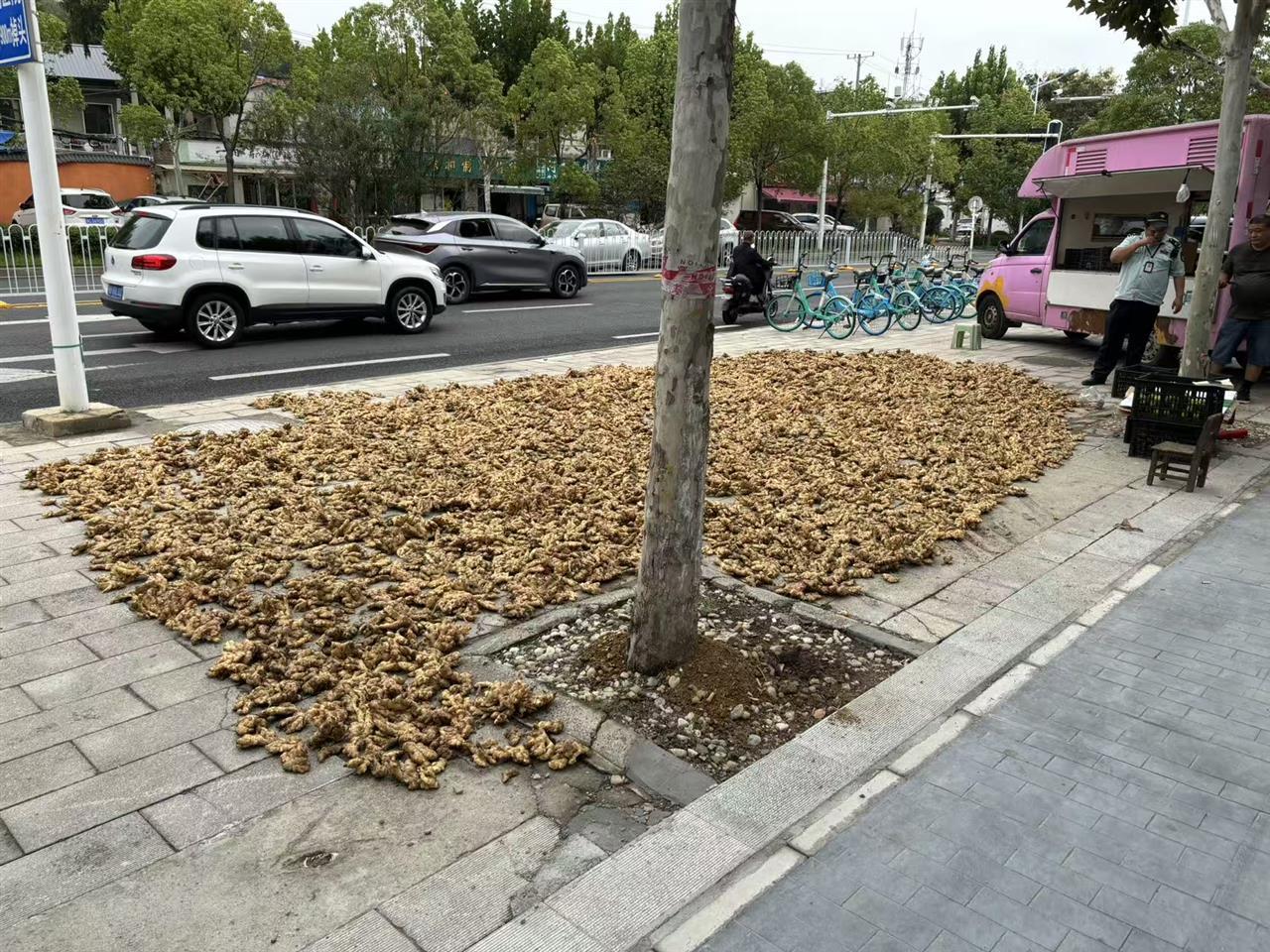 商户违规在人行道上晒生姜