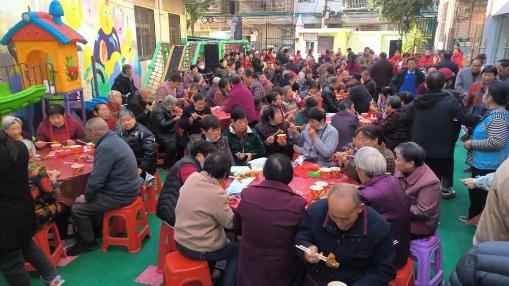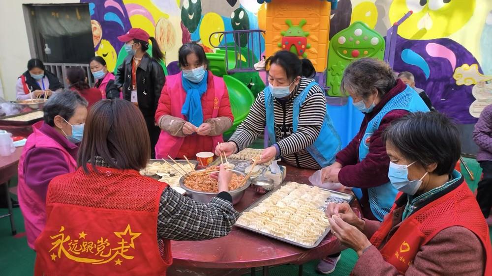 舞台旁,包饺子区域同样热火朝天。社区工作人员、志愿者、幼儿园老师分成和面、擀皮、调馅、包饺子、煮饺子“五条流水线”,短短一小时,3000只皮薄馅大的猪肉韭菜饺新鲜出锅。老人们围坐长桌,蘸醋唠嗑,一口饺子一句家常,邻里情在热气升腾中迅速升温。针对辖区12名高龄失能老人,机动组还贴心送上“饺子入户”服务,让温暖不漏一人。