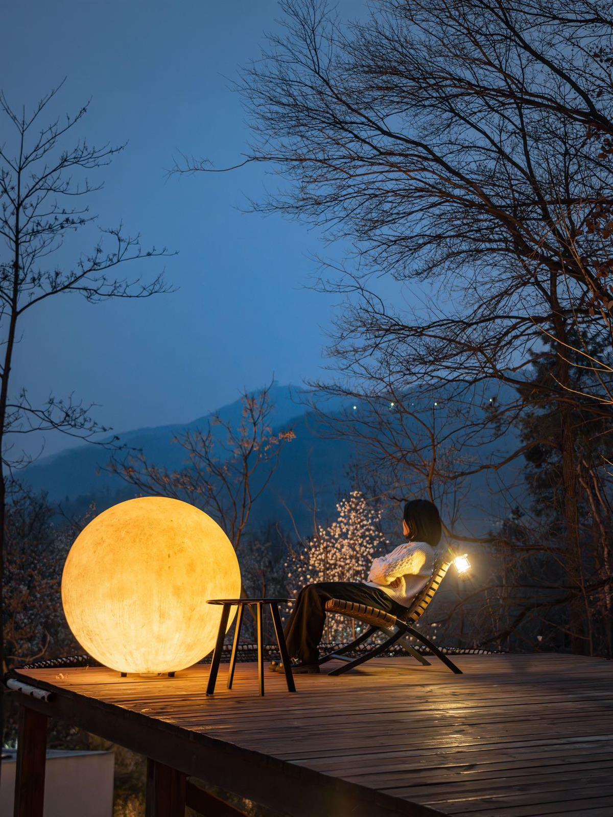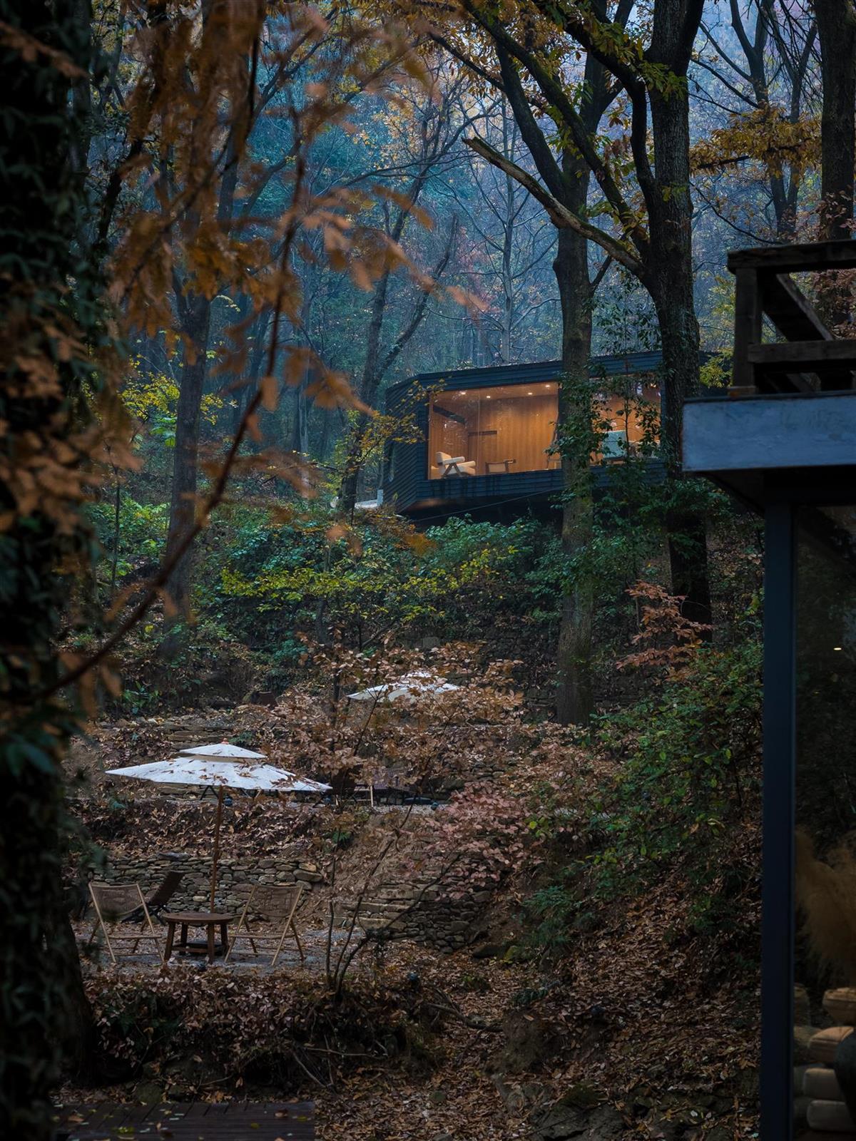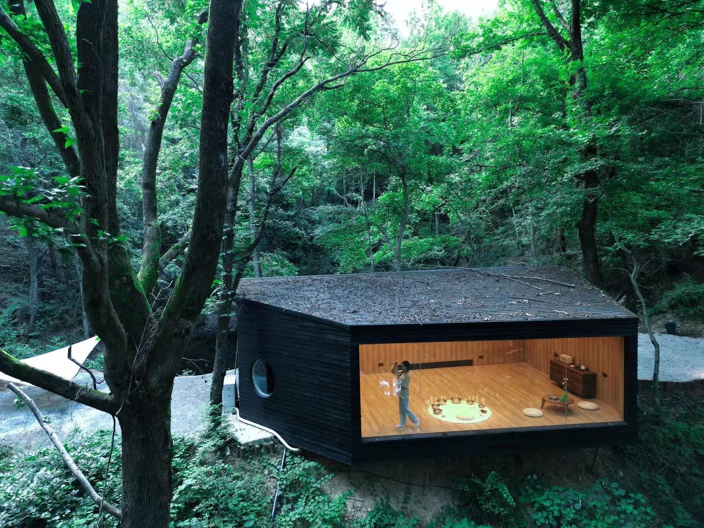 这种对原创的执着,在森林疗愈木屋中达到极致。正面落地玻璃将森林景观全景引入,背面半开放式汤屋让树木穿房而过,雨天听雨滴打檐,冬夜观雪落池塘。这个融合疗愈与居住功能的空间,不仅让民宿冬季入住率提升3倍,更入围国际设计大奖Architizer A+Award。
