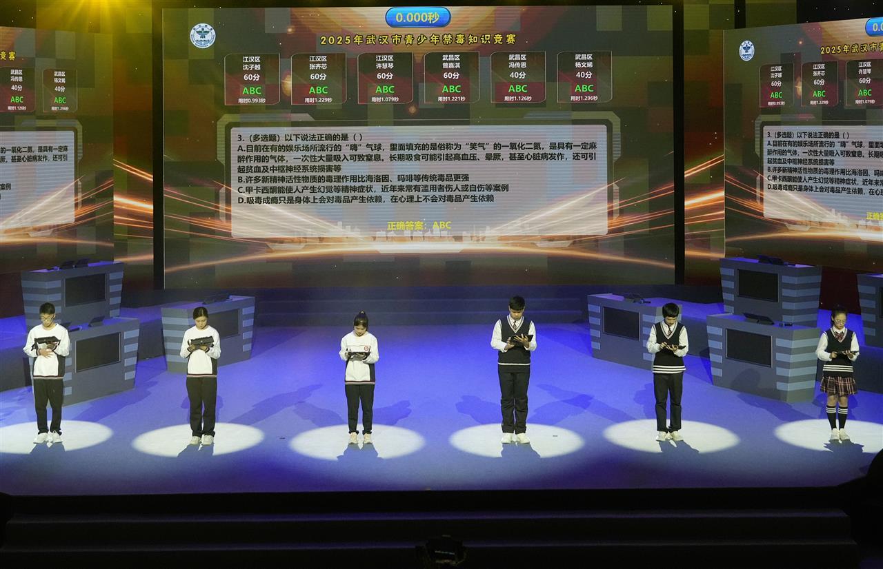 金秋十月,丹桂飘香。10月24日下午,武汉教育电视台演播厅内座无虚席,掌声与欢呼声交织回荡。以“青春不‘毒’行,筑梦成长路”为主题的2025年武汉市青少年禁毒知识竞赛决赛在此隆重举行,从全市16支代表队中突围的江汉、东西湖、武昌、砺志中学、江岸、硚口、江夏、东湖高新区等8支队伍齐聚一堂,队员们向着“个人答题王”的称号与团体冠军荣誉发起终极冲刺。