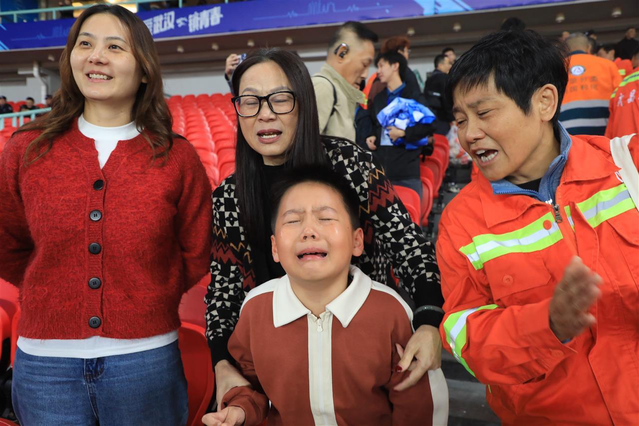 当比赛进入尾声时,比分定格在1:2,武汉三镇队遗憾落败。离场的音乐响起后,“环卫小球童”葛子岳再也忍不住放声大哭起来。“没事的,今天输了,我们还有两场,一定还能再赢回来!”李红梅与现场球迷们纷纷走上前,用轻柔而坚定的声音安慰着小球迷。