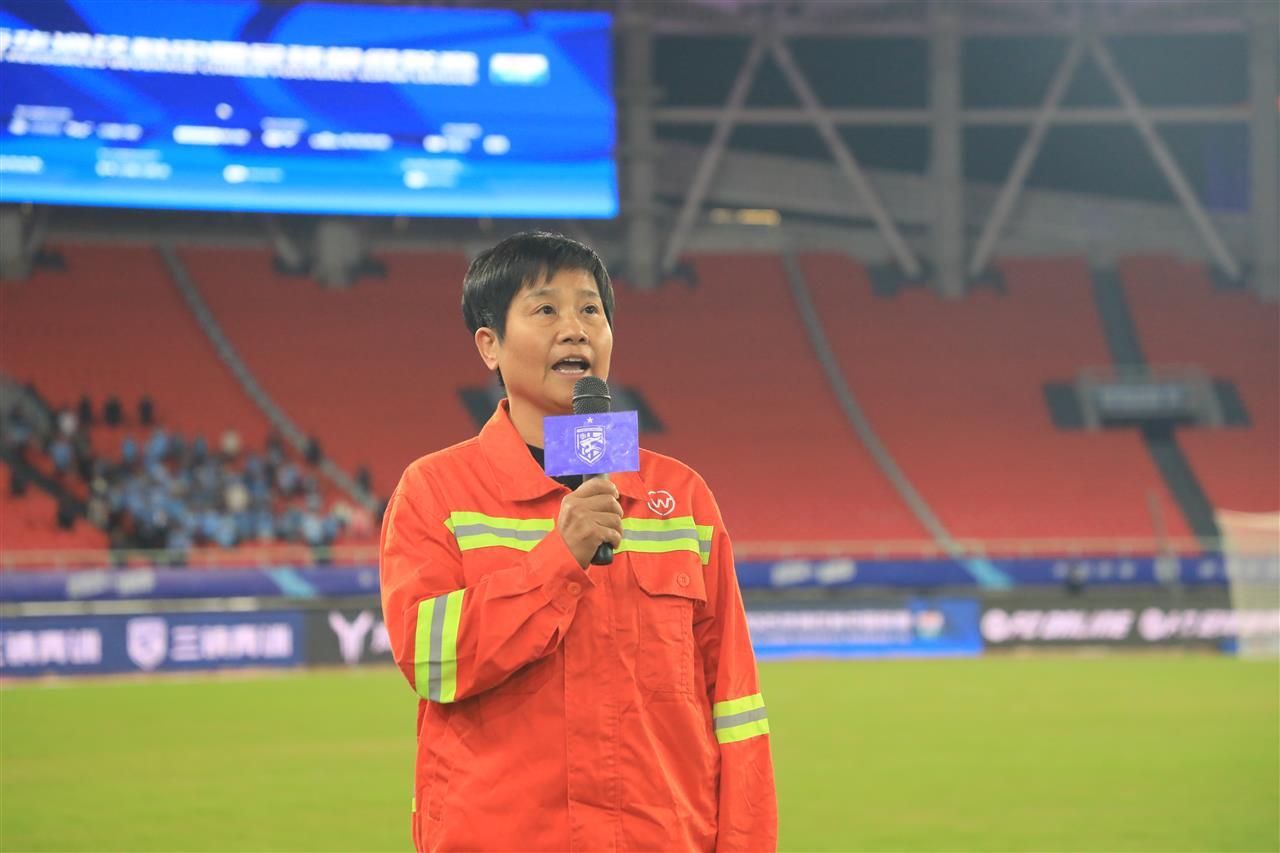 本场比赛是武汉足球赛事首次设置“国歌领唱”环节,特邀武昌区城管执法局大桥清洁队党支部书记、负责人李红梅担任国歌领唱员,带领全场齐声高唱国歌。今年57岁的李红梅,已在环卫一线工作35年,曾荣获“湖北省五一劳动奖章”“湖北省先进工作者”“武汉市劳动模范”“武汉市三八红旗手”等多项荣誉。“我也是老球迷了,98年那会就爱看武钢的足球比赛。”在休息区,李红梅聊起了对足球的热爱,“今天能作为环卫工人代表领唱国歌,我很荣幸,这是我们全体环卫工人共同的荣誉。”